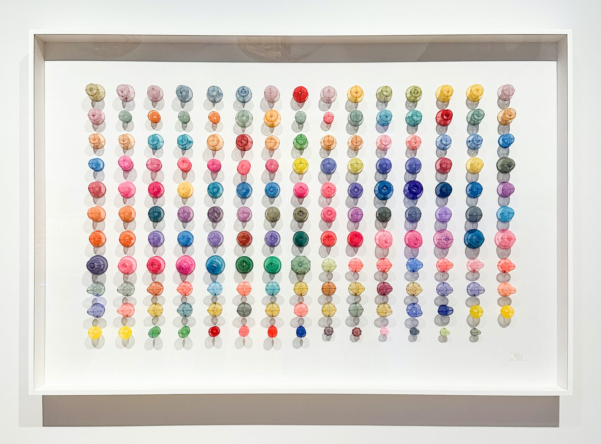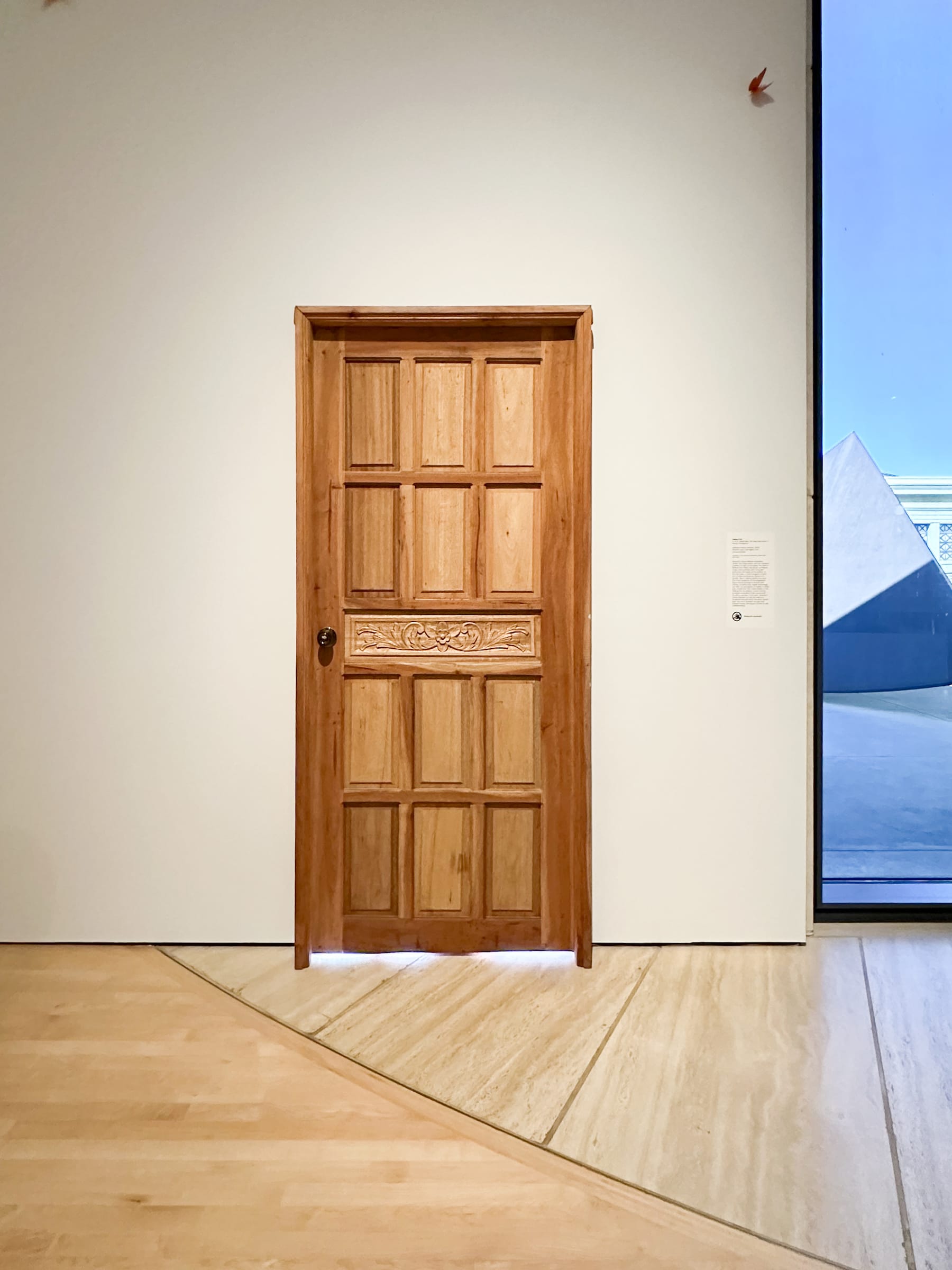 STANFORD, Calif. — Some of the first artworks I encountered when I visited Spirit House were doors. Installed along an outer wall of the Cantor Arts Center, James Clar’s wooden door is etched with motifs commonly found in the Philippines. A programmed LED light along the bottom gap makes it appear as if people are walking past, though, of course, the door is just a facade. Similarly, Do Ho Suh’s “Doorknobs: Horsham, London, New York, Providence, Seoul, Venice Homes” (2021), a collection of delicate door handles sewn from colorful translucent fabric, are based on ones found in his previous residences. The handles have been divorced from their original function and are too delicate to touch. Both these pieces deny passage while hinting at a presence beyond what is seen: the illusion of passersby in Clar’s door and the memory of previous spaces in Suh’s.
