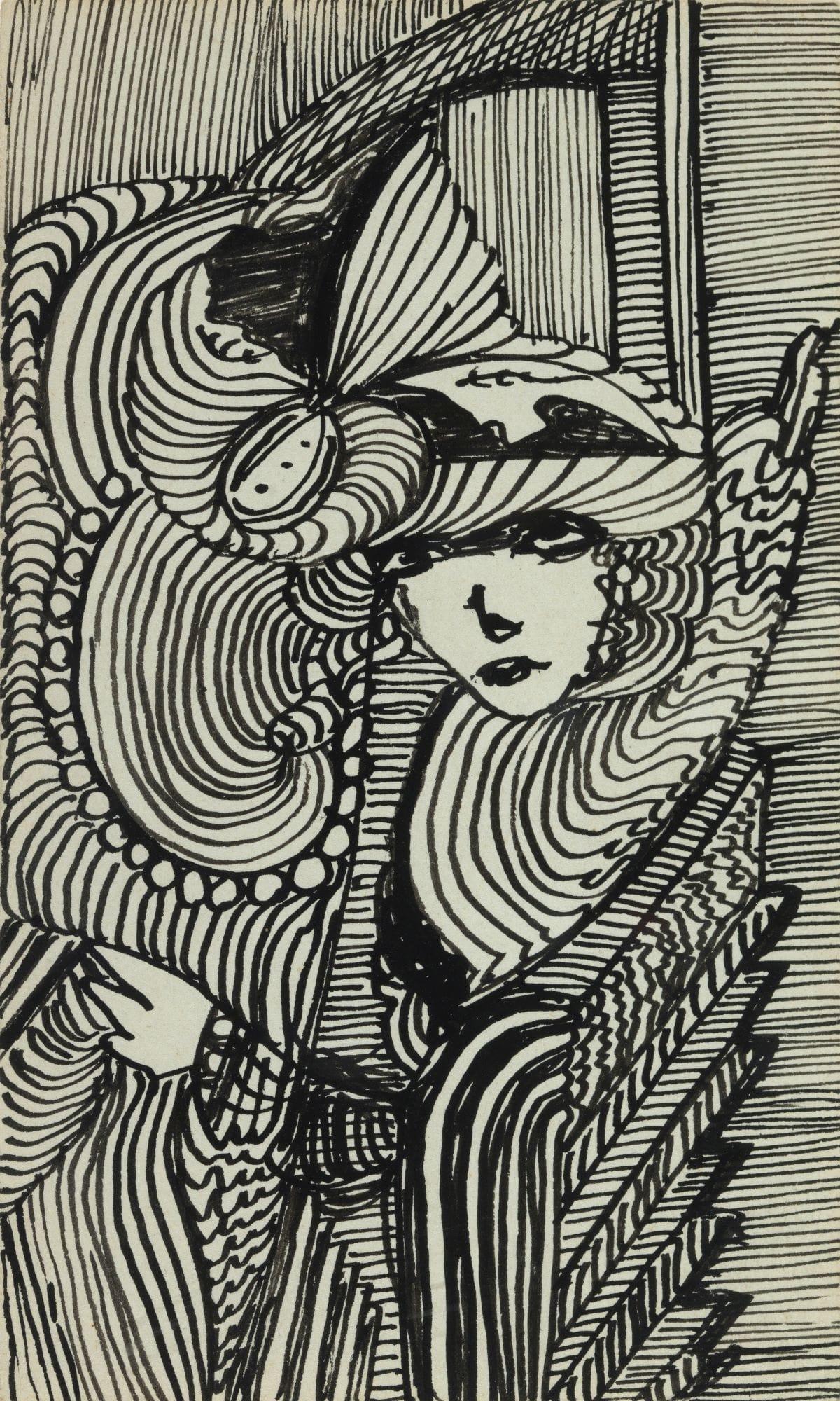 Baker began centering spiritualist acts in her work while homebound during the pandemic lockdowns of 2020. The isolating conditions caused by Coronavirus restrictions echo the solitary environments of many creative mediums that communicated in private. From 1920 until 1958, Madge Gill’s prolific practice, led by her spirit guide Myrninerest (interpreted to mean “my inner rest self,”) was predominantly active while alone late at night in her East London home. Often these spirit-led evening sessions would produce monochromatic ink drawings on postcards in which stylistic feminine faces were surrounded by a vortex of architecturally rendered ectoplasm, at times even signed: Myrninerest.