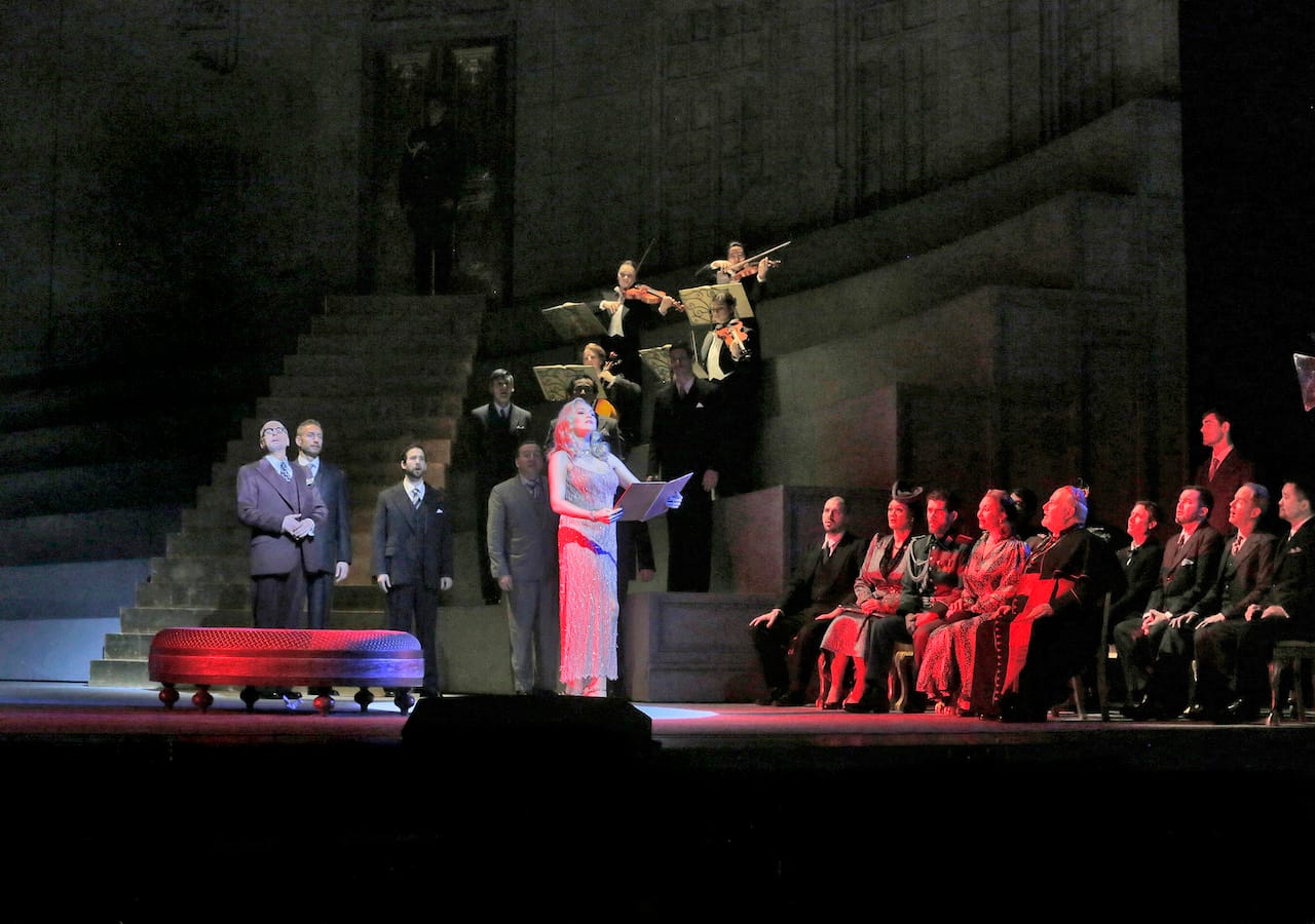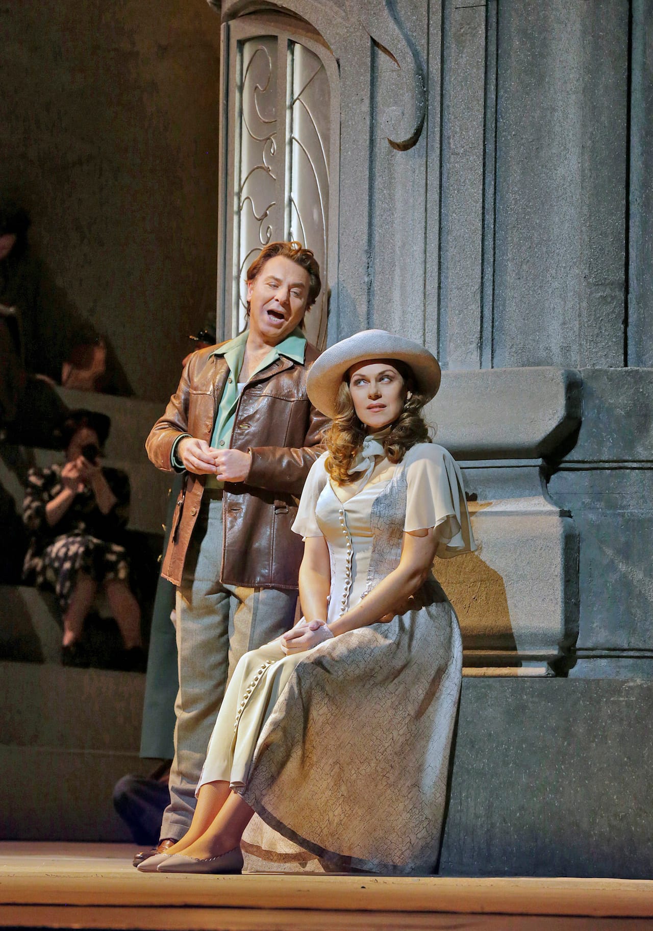 The Met’s new production of Puccini’s Manon Lescaut, directed by Richard Eyre, takes place in a meticulously, even extravagantly realized World War II France, with sidewalk cafes and lots of Nazis. The precision of the staging is emphasized by a projection that appears before the first act telling us we are in “Amiens, 1941.” This approach is, I’m sorry to say, extremely typical for the Met’s current artistic program: take an opera, transpose it onto another time in history (usually recent, but not too recent), and re-create the details as if it were a costume-drama movie (or maybe, in this case, a film noir). Let me say, in case I forget to later, that many of the details are very nice: the hats and boas; the uniforms; a menacing knot of men in dark suits sitting around a table; two women gossiping upstage in threadbare skirts and hose.
