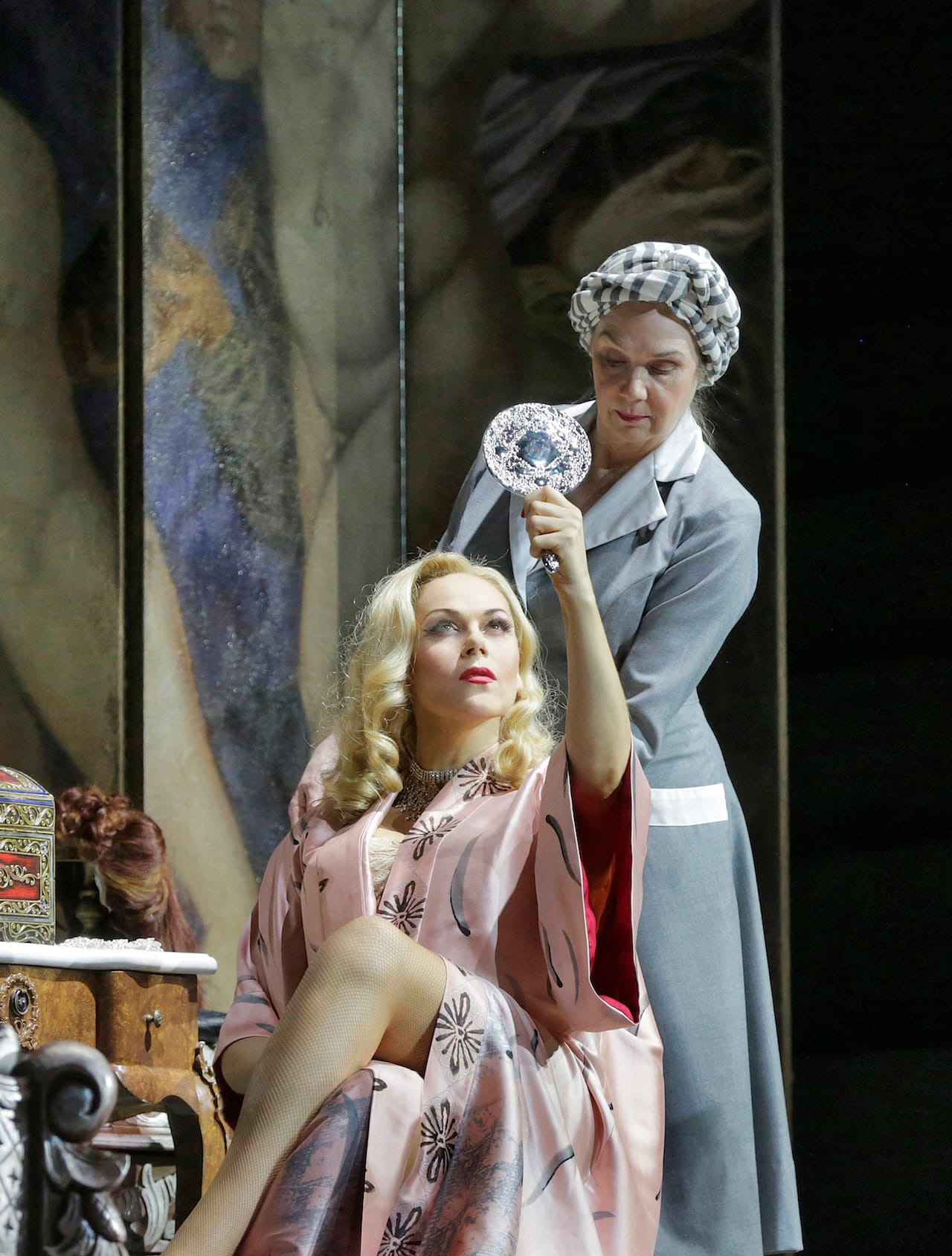 The exception was Act 2, set in Manon’s boudoir when she’s with rich old Geronte in his Parisian palace. Here Eyre and his design team allowed themselves to get weird. Opera directors take note: weird works! Manon is wearing an outrageous kimono and changes into an equally outrageous sequined number. She is being perfumed and made up into a doll. For some reason the triumphal column of the Place Vendôme is protruding through her room. Guests are announced, and a bizarre morning audience takes place, in which Nazis and cardinals gather to watch Manon dance and sing. A bad madrigal is performed by pompously coiffed singers, and it’s followed by a lascivious dance lesson. There is a pervasive and uneasy feeling of conceit and flattery.