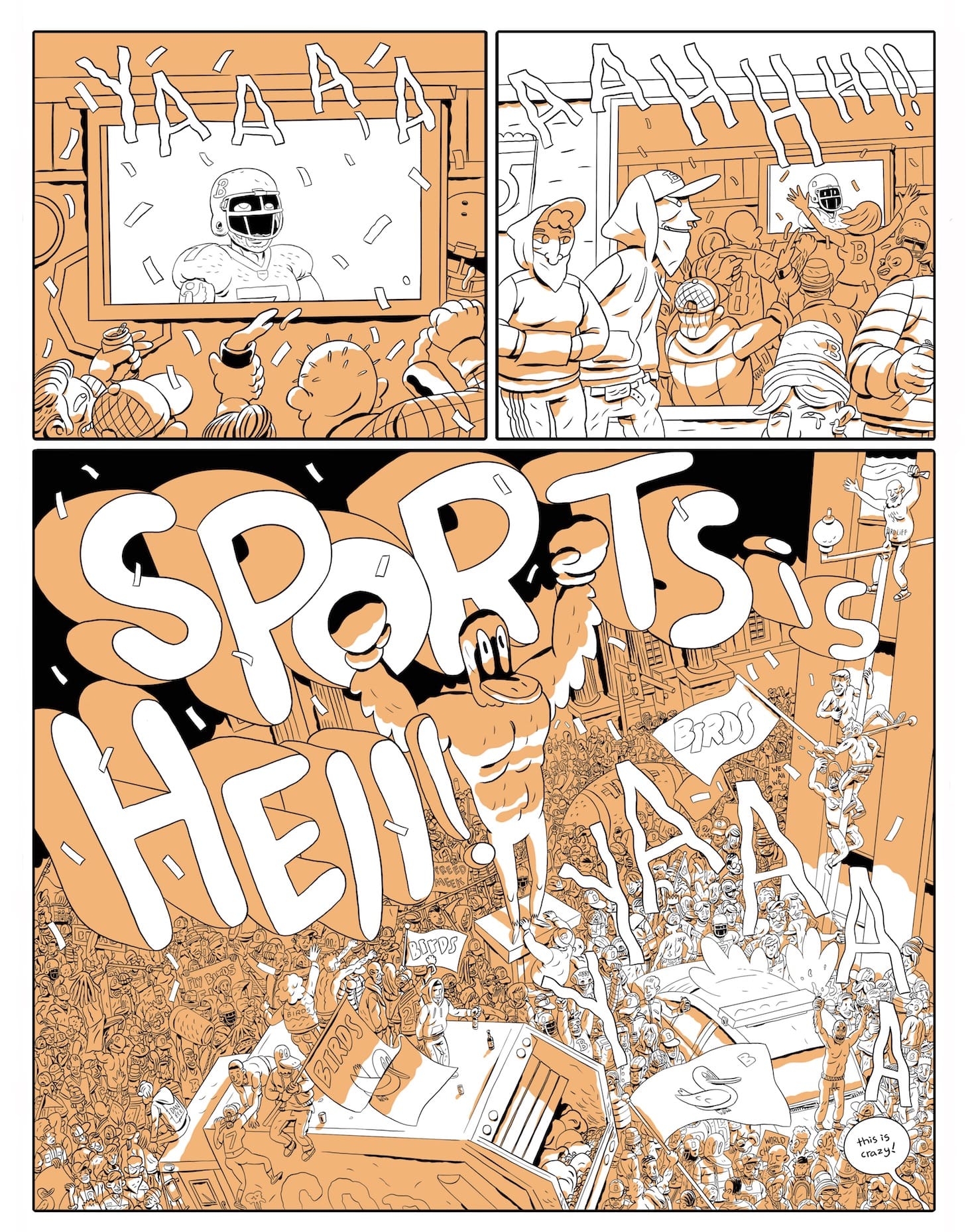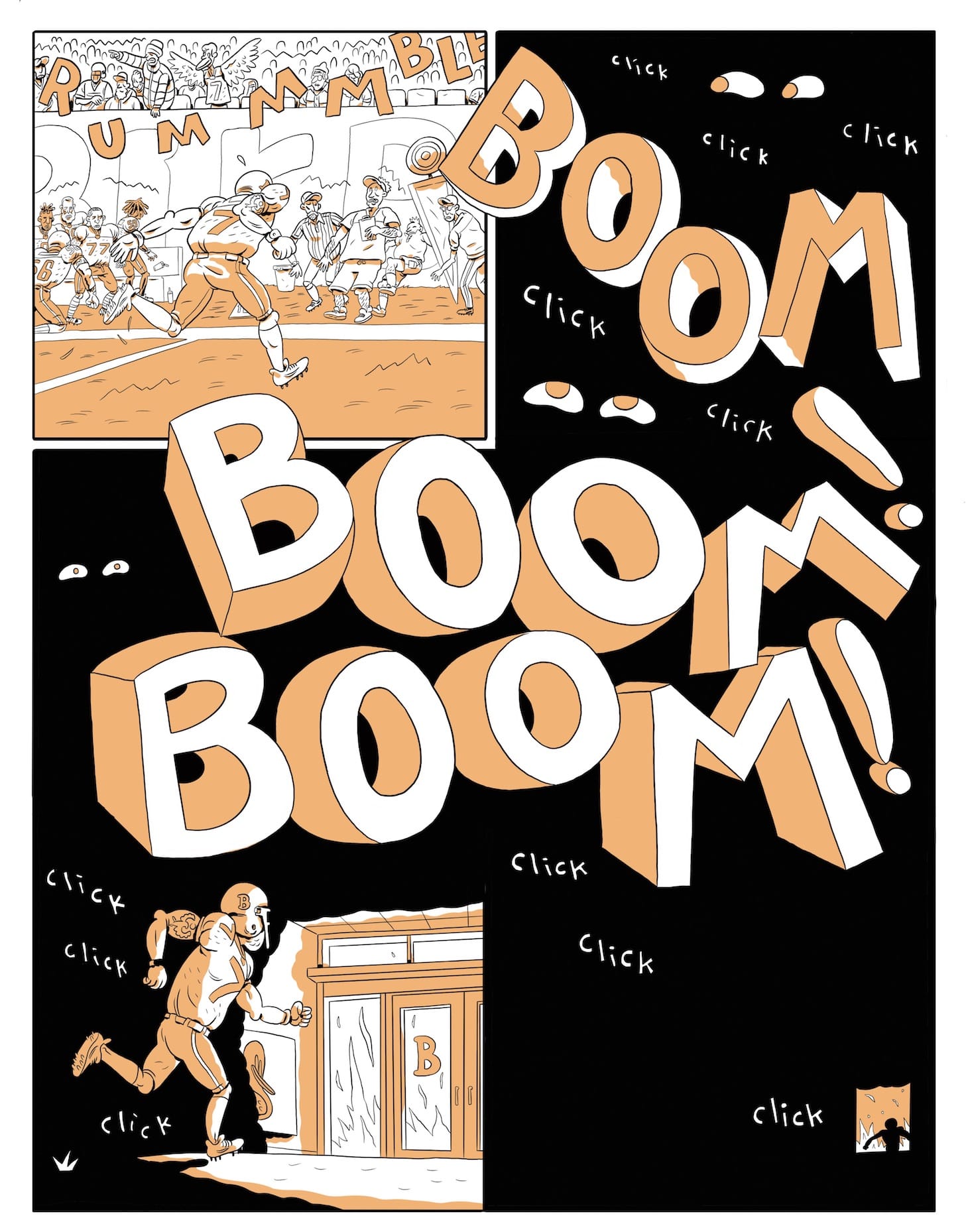 From first glance, Ben Passmore’s Sports is Hell exudes a sense of alarm. With its orange duotone, the graphic novel screams danger! panic! be wary! — a fair warning given its narrow-eyed, satirical look at activism, racism, and police brutality in the US.
