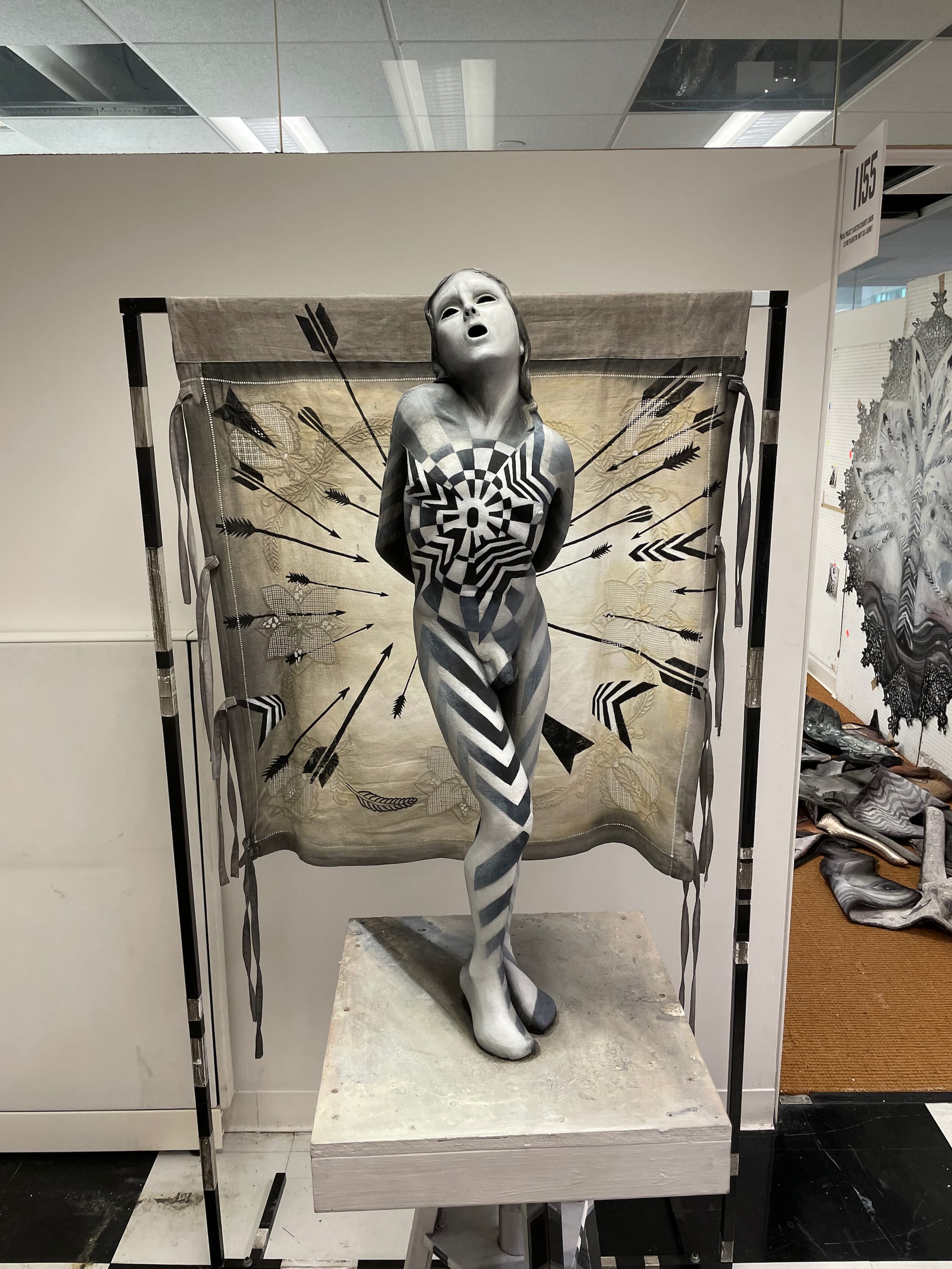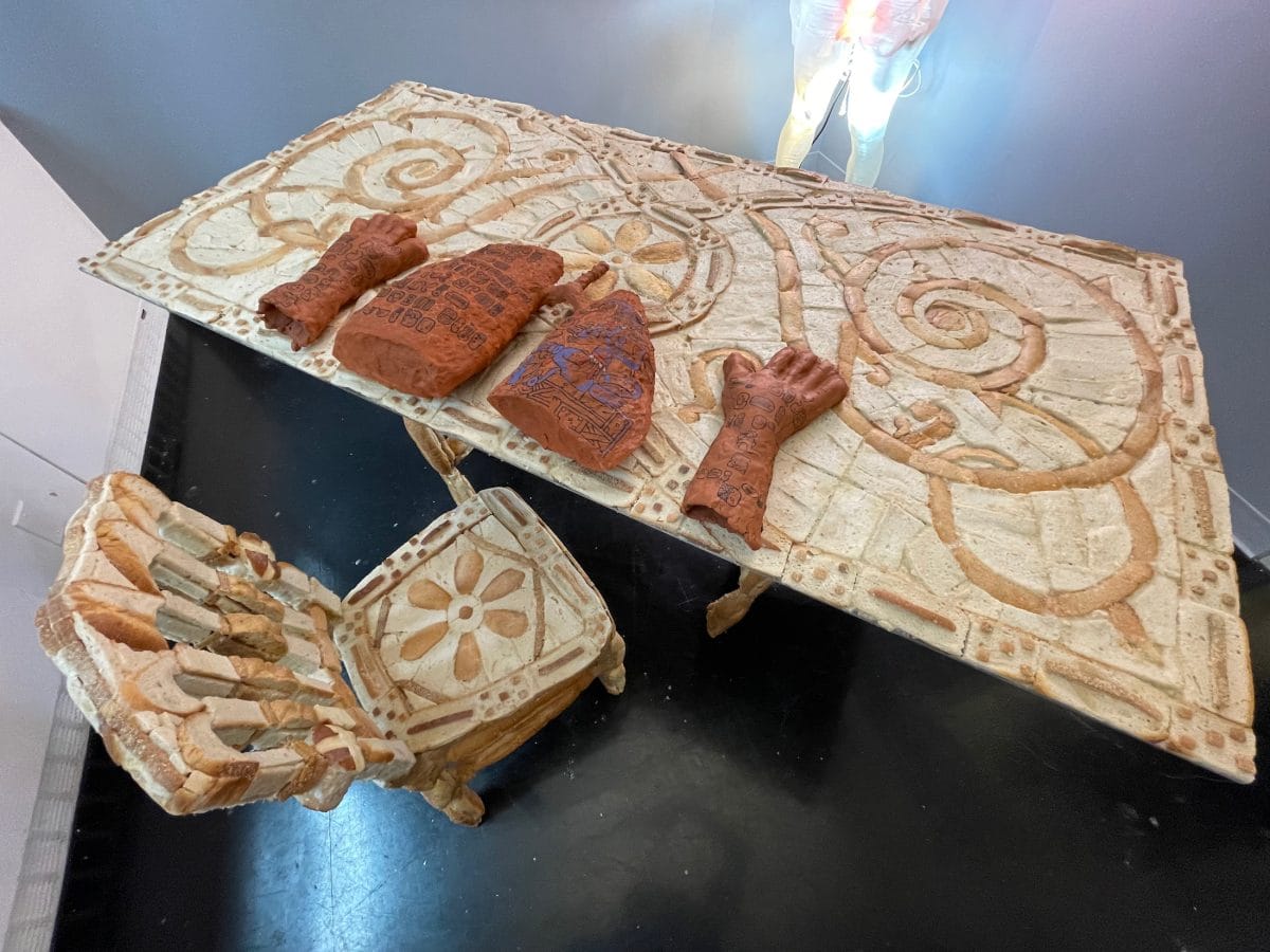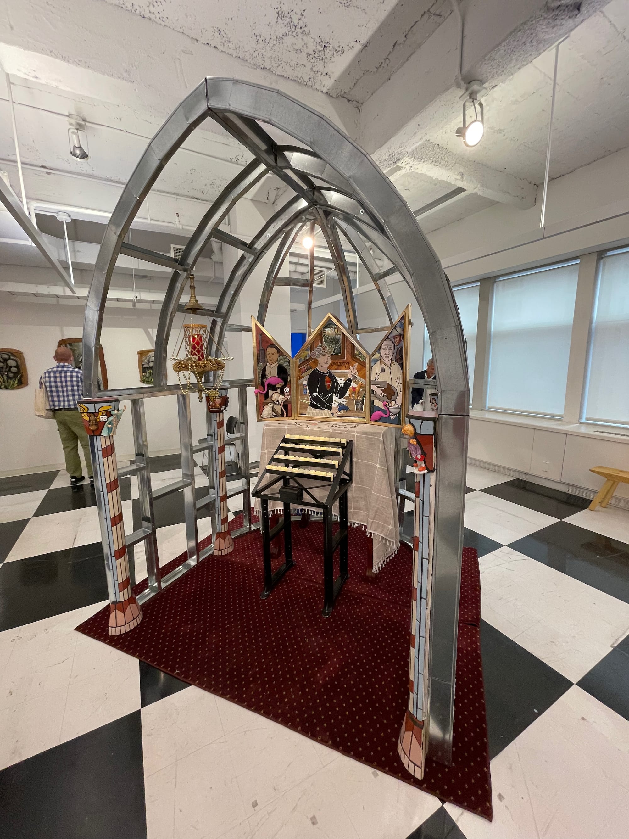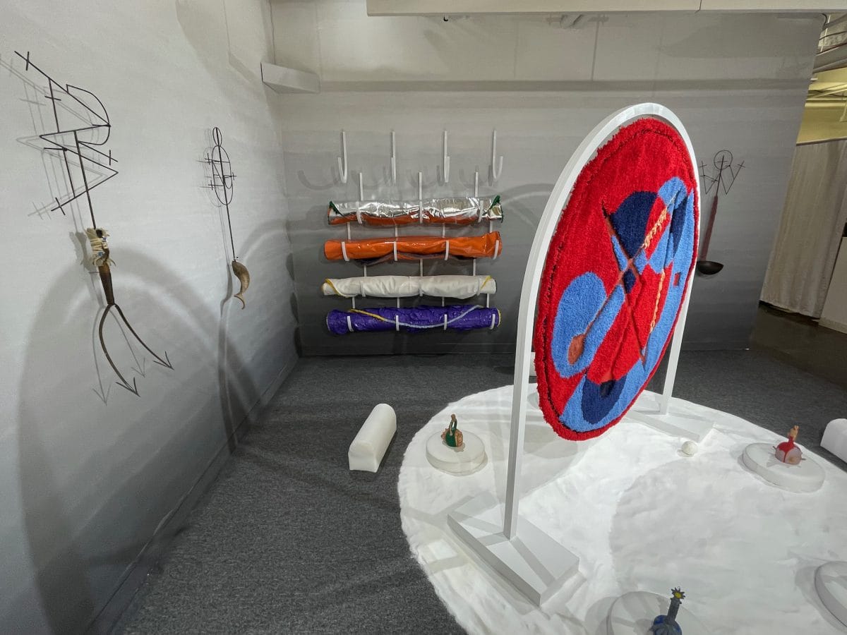 Some use design and architecture to frame their presentations — one booth curated by David Behringer, and featuring art by Chambliss Globbi, has a real 15th-century table at the center, while Cade Tompkins Projects, featuring artists Bob Dilworth and Nafis M. While, even recreates an arcade of pointed arches that evokes stripped Tuscan churches. Others fully embrace embroidery, tapestries, and other woven works, including Steve Locke's Jacquard works at Rivalry, Anne Spalter's AI-generated plague tapestries, Michael Sylvan Robinson's "To Ward Off Late Stage Capitalism" sculptural garment, and Macauley Norman's spider-like works at The Castle of the Spider's Web — and these are only a sampling of the dozens of works in this vein. A few even use decorative bread, combining the romance of medieval bread making with a more recent pandemic one (Bianca Abdi-Boragi's excellent chair and table made of bread is a showstopper at the Spelling Afterlife presentation by curator Taylor Hansen Hughes, and Adriana Gallo's bread sculptures at Blessed Bodies, curated by Abby Cheney and Hanna Washburn, are a delight).