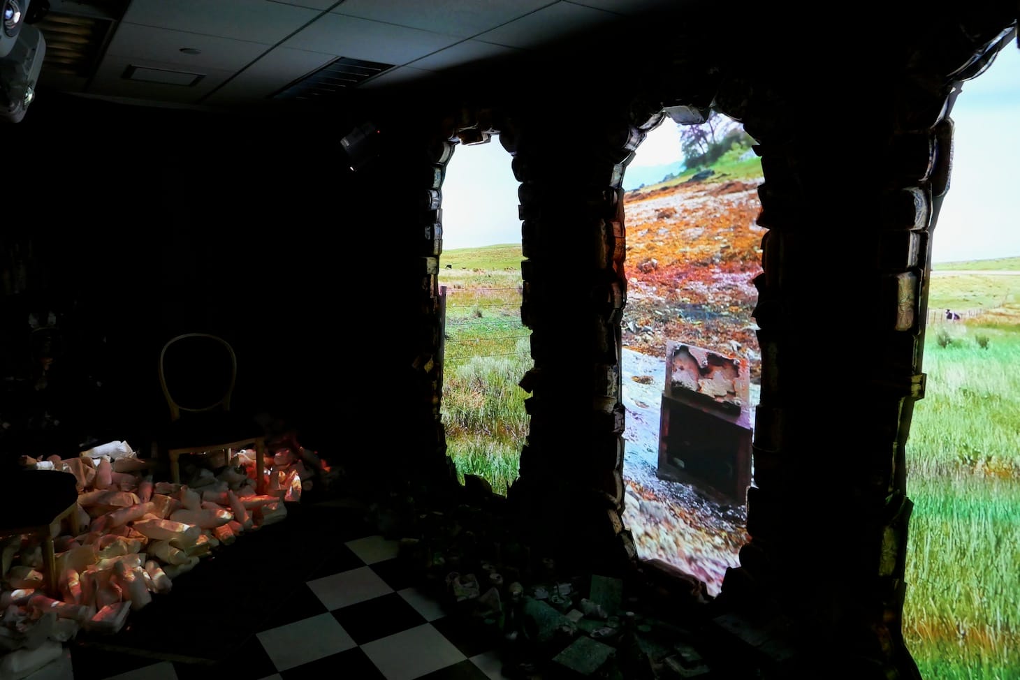 I picked up the theme of living under the threat of climate change in several projects. The one I appreciated the most was Rachel Schmidt‘s “Vanishing Points” (curated by Dawne Langford), which uses video projections, furniture, and a host of single-use consumer items to construct a vision of opulence set in a dystopian future where we have at last collectively depleted the earth of most of its natural resources. Schmidt’s installation is foreboding, yet inviting, precisely because of its ravishing footage, shot in Taiwan and Scotland.