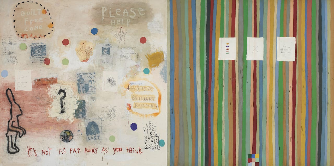 On the left side of “Everything 2” (2002), Carnwath wonders if, when she gets old, she will have to hang signs on appliances telling her that it is an “oven” or “vacuum cleaner.” Elsewhere on the left side of the painting, one reads “PLEASE HELP,” “IT’S NOT AS FAR AWAY AS YOU THINK,” and “GUILT FREE ZONE.” The pressure of mortality and its concomitant feeling of fragility are felt throughout “Everything 2” and other paintings, but it never becomes overbearing because it is inclusive. In one way or another we have all considered where a moment of forgetfulness might lead. At the same time, Carnwath, who refuses to descend into bathos and melancholia, declares the painting to be a guilt-free zone, a place where one doesn’t censor one’s thoughts or pay penance for loving what you do. She is claiming that the space of painting can be paradisiacal, a sustaining place, where you don’t have to ignore the world or suppress your fears. As she states on the right side of the painting, on one of three trompe l’oeil sheets of paper “affixed” to its striped surface: “IT IS THE PAINTING THAT TAKES CARE OF ME.