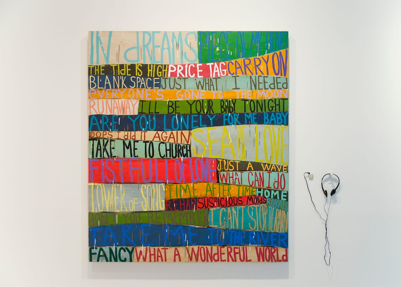 In the three paintings consisting solely of song titles, each of which is written on a its own band of color, Carnwath’s playlist echoes the way we curate and listen to songs, often fitting the mood we are in. In the painting “A Little Sad” (2015), which is largely done in grays, blacks, and off-whites, the titles written out capital letters include “I’M SO LONESOME I COULD CRY,” “ONLY LOVE COULD HURT LIKE THIS,” and “GOODBYE CRUEL LOVE.” An iPod with all the painting’s songs accompanies each painting, and can be listened to while viewing the work. In these paintings, Carnwath’s motivations for grouping particular song titles together seem to be generated by the songs themselves. Her selections end up being both personal and collective; they are not about her.