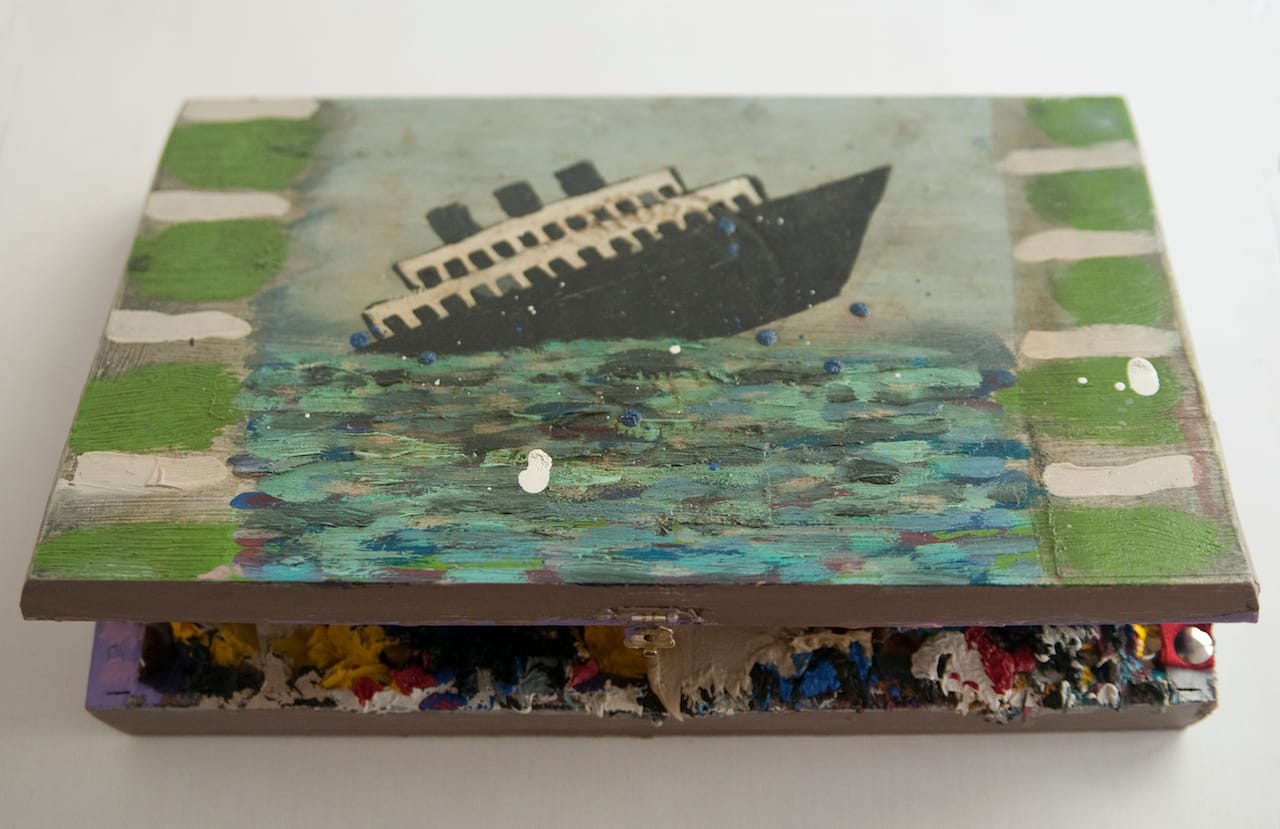 For those viewers who are new to Carnwath’s work, the selection of eleven paintings done between 1995 and 2015, the four cigar boxes, dating between 1999 and 2015, and the wall of drawings and notes–items one would usually find on her studio wall–from 2012-2015 and titled “Crazy Papers,” is a good introduction to an artist deserving wider attention. Along with the earliest painting in the exhibition, a painted-text piece, “Things Green” (1995), there are three recent works made up solely of words. Although separated by two decades, what “Things Green” (1995) and a work like “Girls” (2015) — which, like the other two newer works, is a sequence of song titles — have in common is Carnwath’s tracking of the drift of her thinking, which underscores the desire to organize the terrain one’s mind moves through. Moreover, the viewer gets a sense of Carnwath’s ability to seamlessly mesh the offbeat with the factual, to extract from the mundane and everyday something unexpected, idiosyncratic, funny, worrisome and ongoing.
