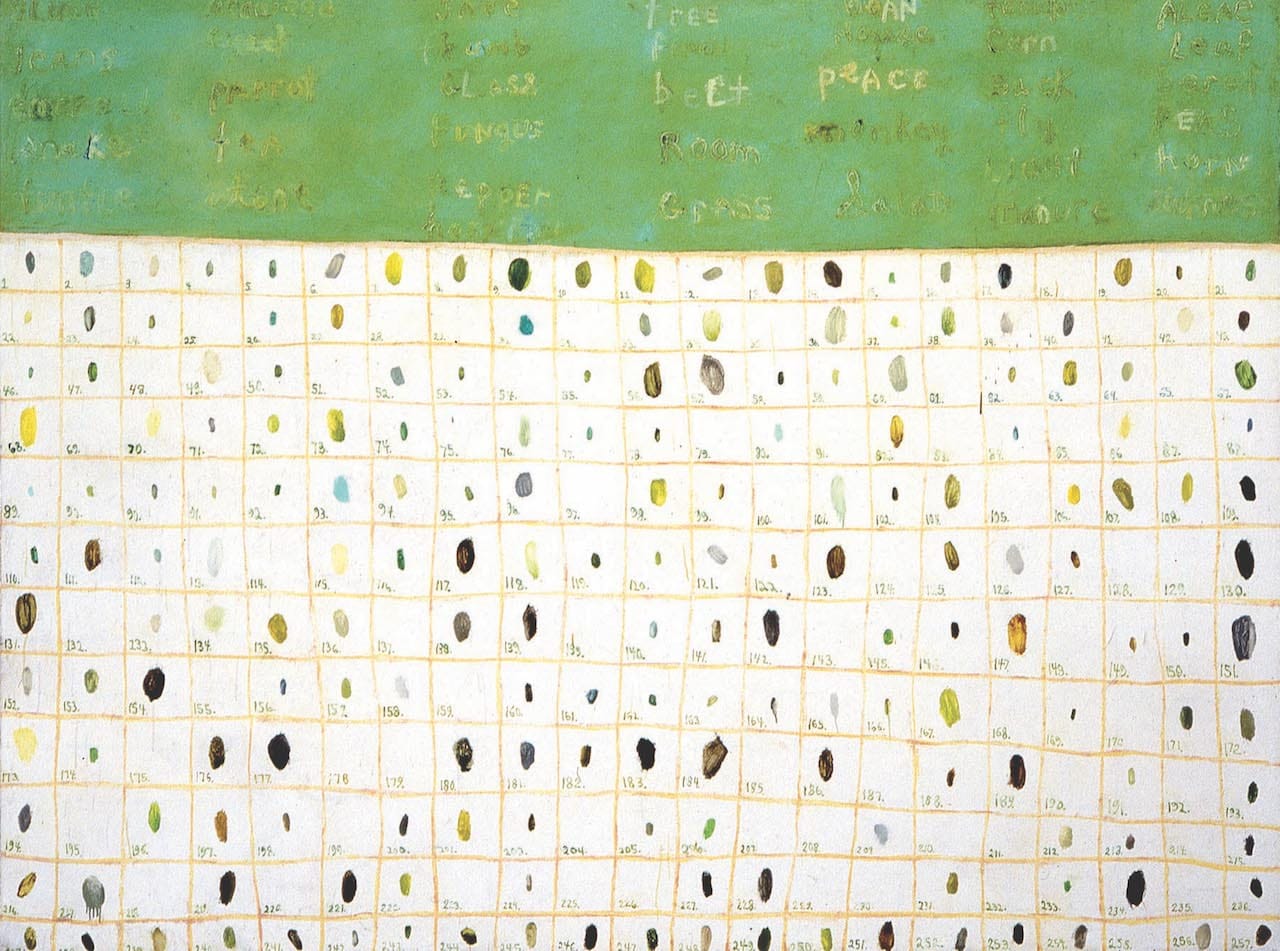 In the upper part of “Things Green,” Carnwath lists words associated with “green” on a green ground: slime, fungus, room, salad, horn, peace, and beret. Below the list she has painted a grid of 257 numbered rectangles that covers the rest of the painting. In nearly every rectangle the artist has deposited a smeary brushstroke or daub of color that is somehow connected to “green,” but not necessarily that color. The gap between the words and myriad colors is just one dance the painting sets in motion. The blank rectangles suggest that no matter how thorough, one will inevitably neglect or not know things – that everywhere there are limits that one encounters.