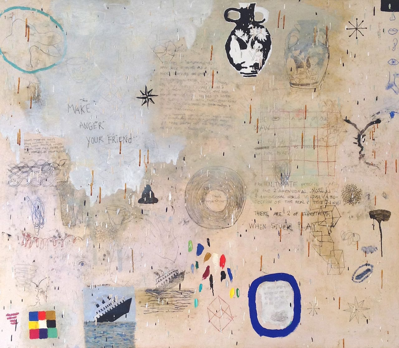 Carnwath’s insistence that everything be done in paint distinguishes her work from that of Cy Twombly, who also combined different motifs and words, and often used oil paint, crayon and graphite in his paintings. The other difference is Carnwath’s definition of “our space.” As Katharina Schmidt stated in a 2011 catalogue essay, Twombly’s work can be understood “as one vast engagement with cultural memory” that draws on historical events and classical mythology. Carnwath, on the other hand, draws most of her inspiration from the present. The crucial difference between Carnwath and Twombly, and what makes them very different artists, is their respective awareness of time. Energized by her consciousness of “time’s winged chariot hurrying near,” Carnwath’s work is suffused by an urgency that is tempered by decorum and humor, a sense that we are all on, as one of her recurring motifs suggests, a sinking ship together.