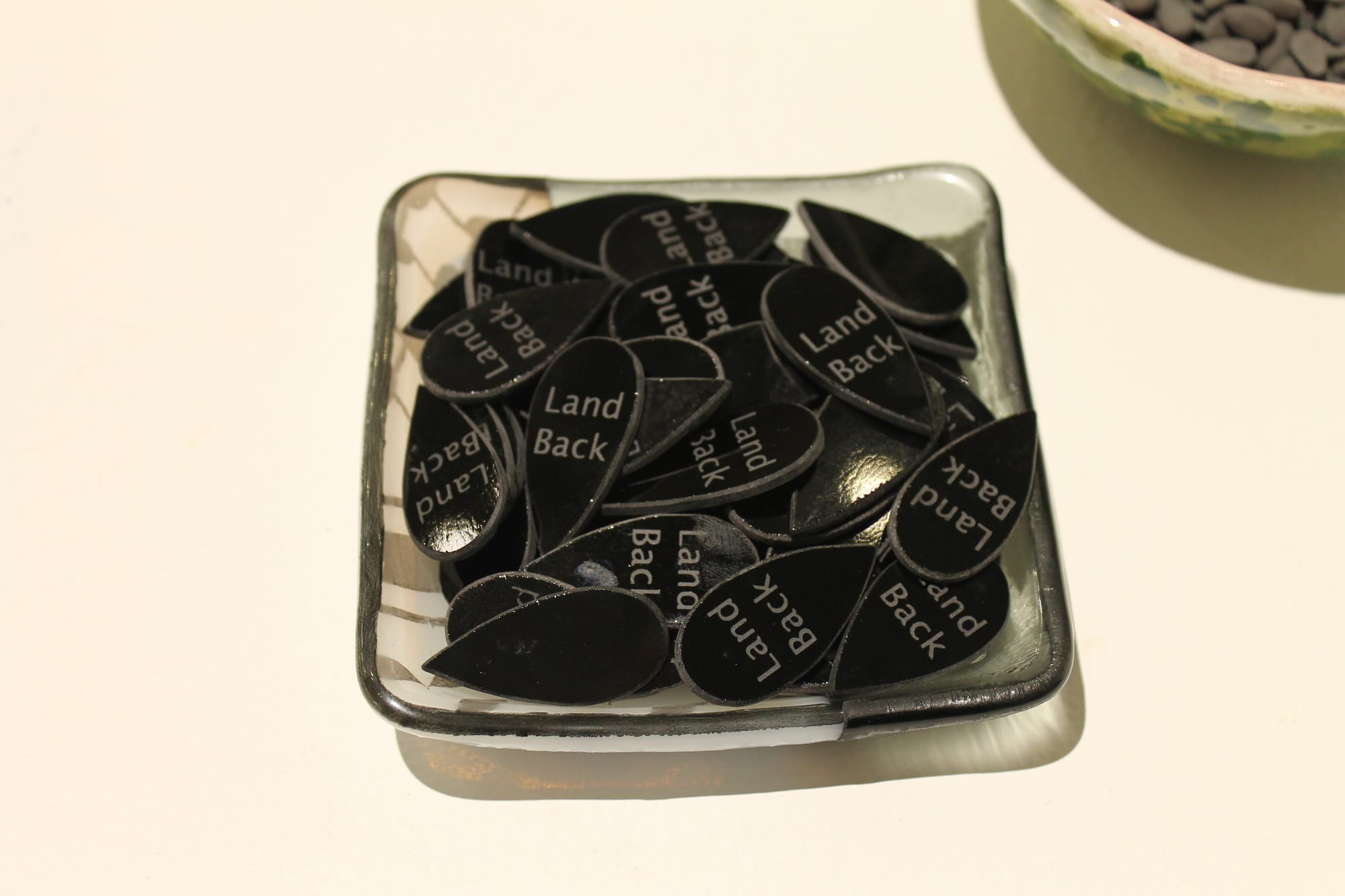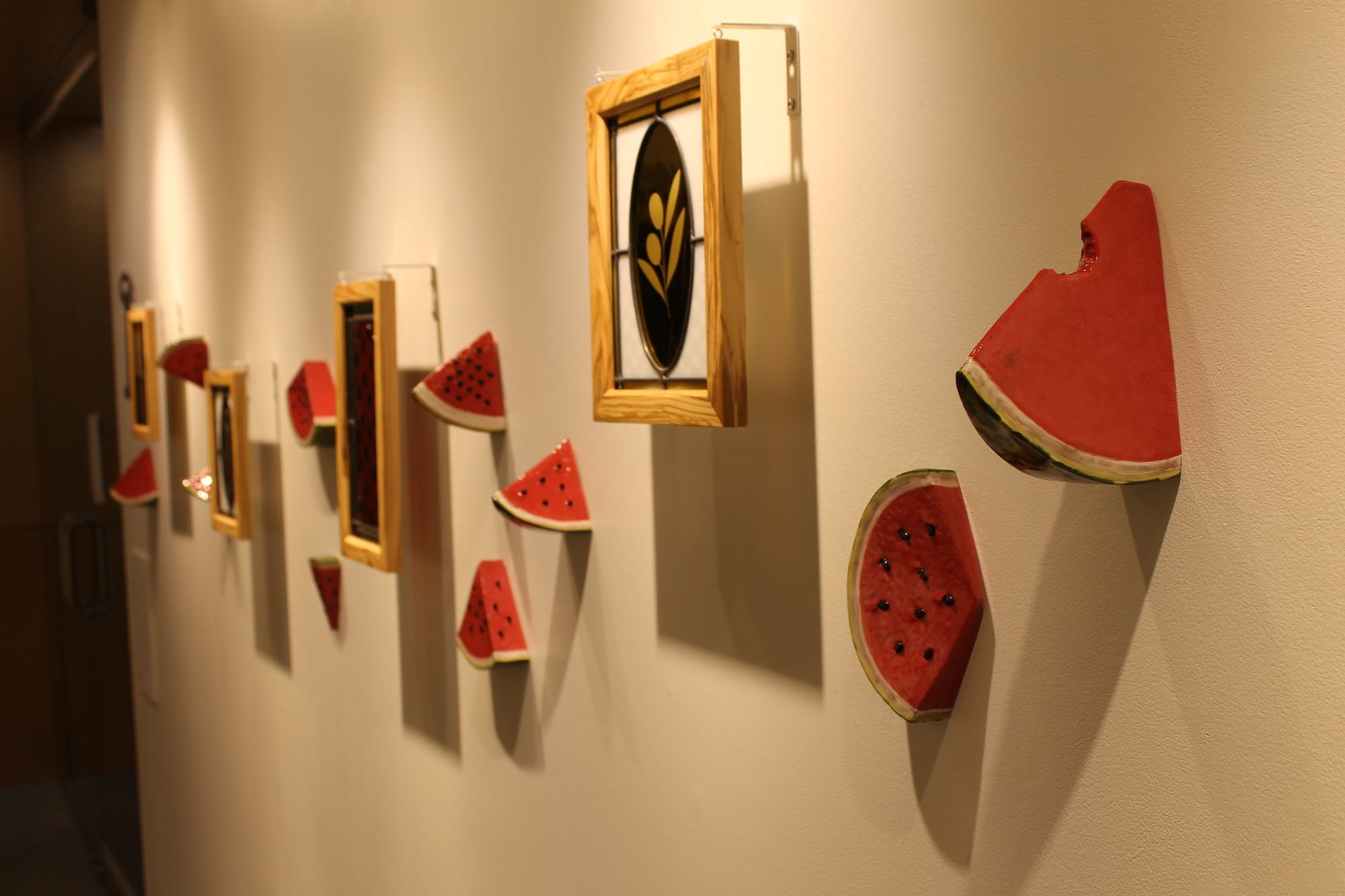 “We were very open and very vocal about what we were doing and why so it was quite a shock to walk into that and find that my work had been censored without any communication whatsoever,” Colette told Hyperallergic, referring to the fact that Craft Alliance removed two of her works — a small fused glass bowl titled “Symbol of Solidarity” and a series of watermelon seed-shaped works with the words "Land Back" carved into their surface — and four title cards (one of which featured the phrase “From the River to the Sea” and another with the title "Indigenous to Palestine") shortly before the opening.