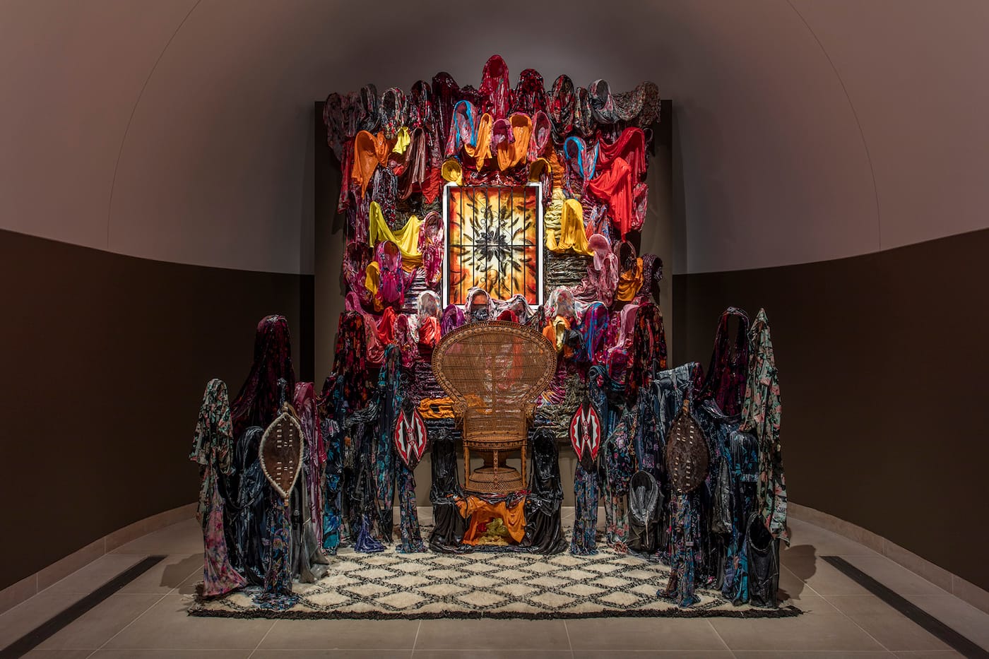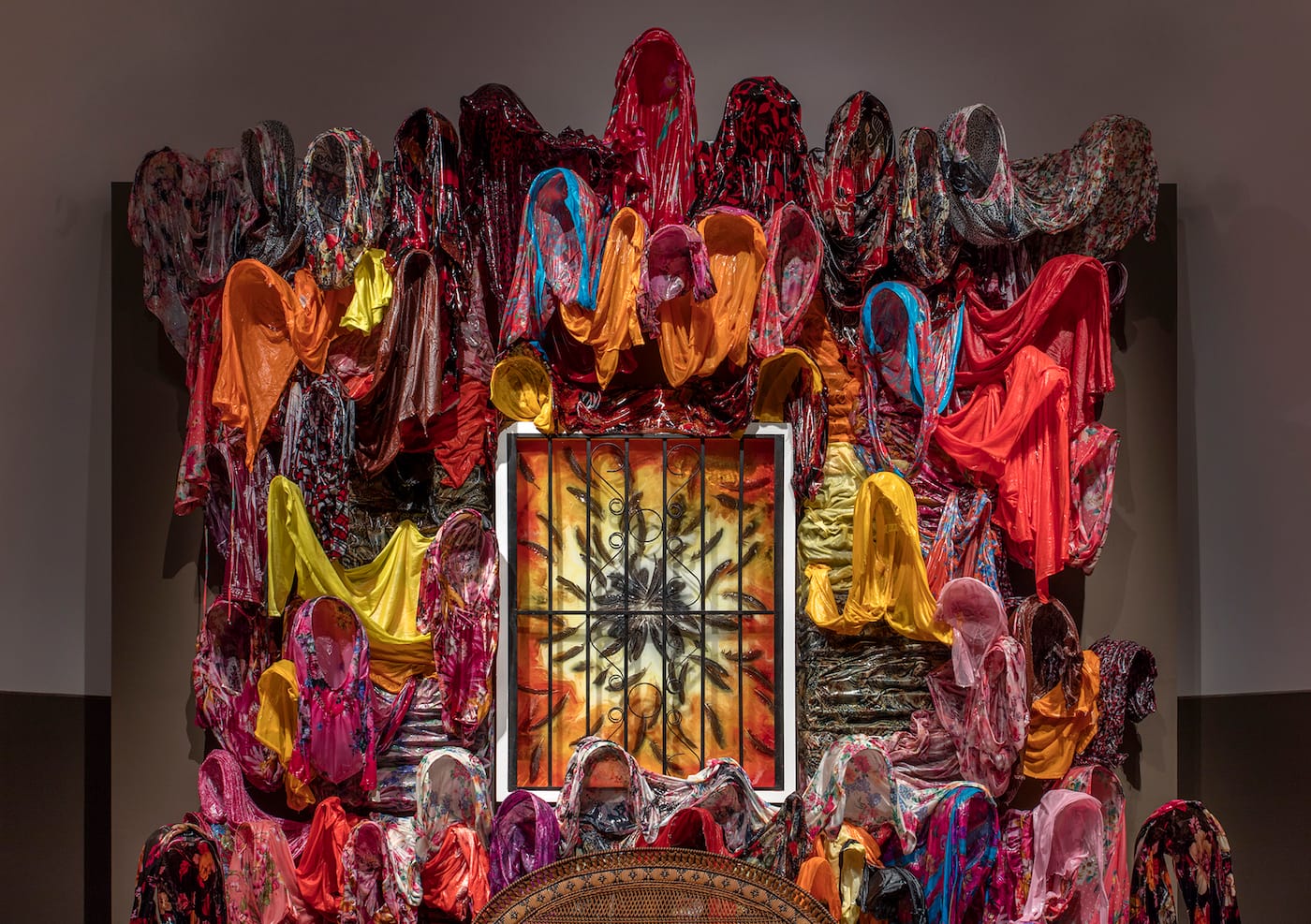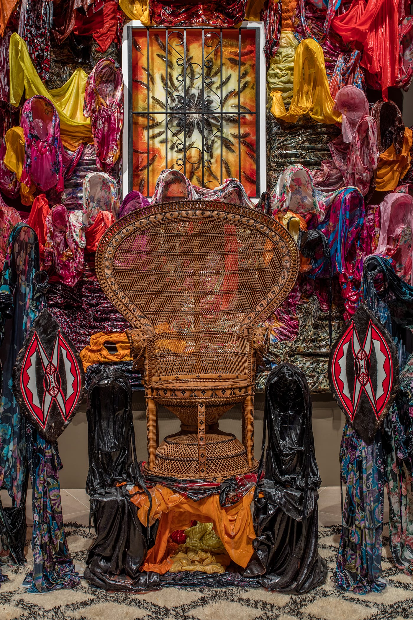 After padding softly around the curtain, the viewer is confronted by an altar that has been carefully arranged and spotlit in the apse. A single wicker peacock chair, raised slightly off the floor on a platform strewn with clothing, is centered on a diamond-patterned rug and flanked by a number of floating housedresses — shellacked phantoms with invisible bodies. Headless hoods face the audience. A pair of sweatpants halfheartedly hovers. A thin, molded figure clutching a black and red shield sits by each armrest. A flaming scarlet and gold sunburst hangs above and behind the throne, feathers dispersed across its shiny surface, a grate placed over its rectangular frame. More veils in florals and paisleys encircle the altarpiece.