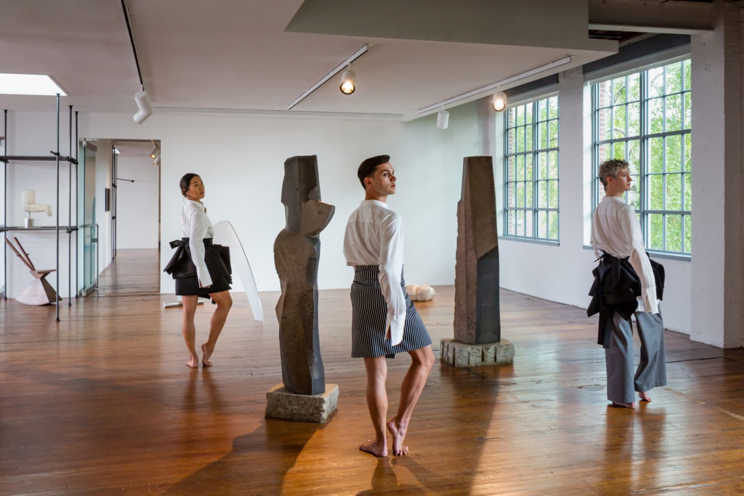 For Contract and Release, choreographed by Brendan Fernandes, three dancers assume their positions amid a selection of Noguchi’s works that allude to the human form and proceed to slowly perform a prescribed set of tasks.