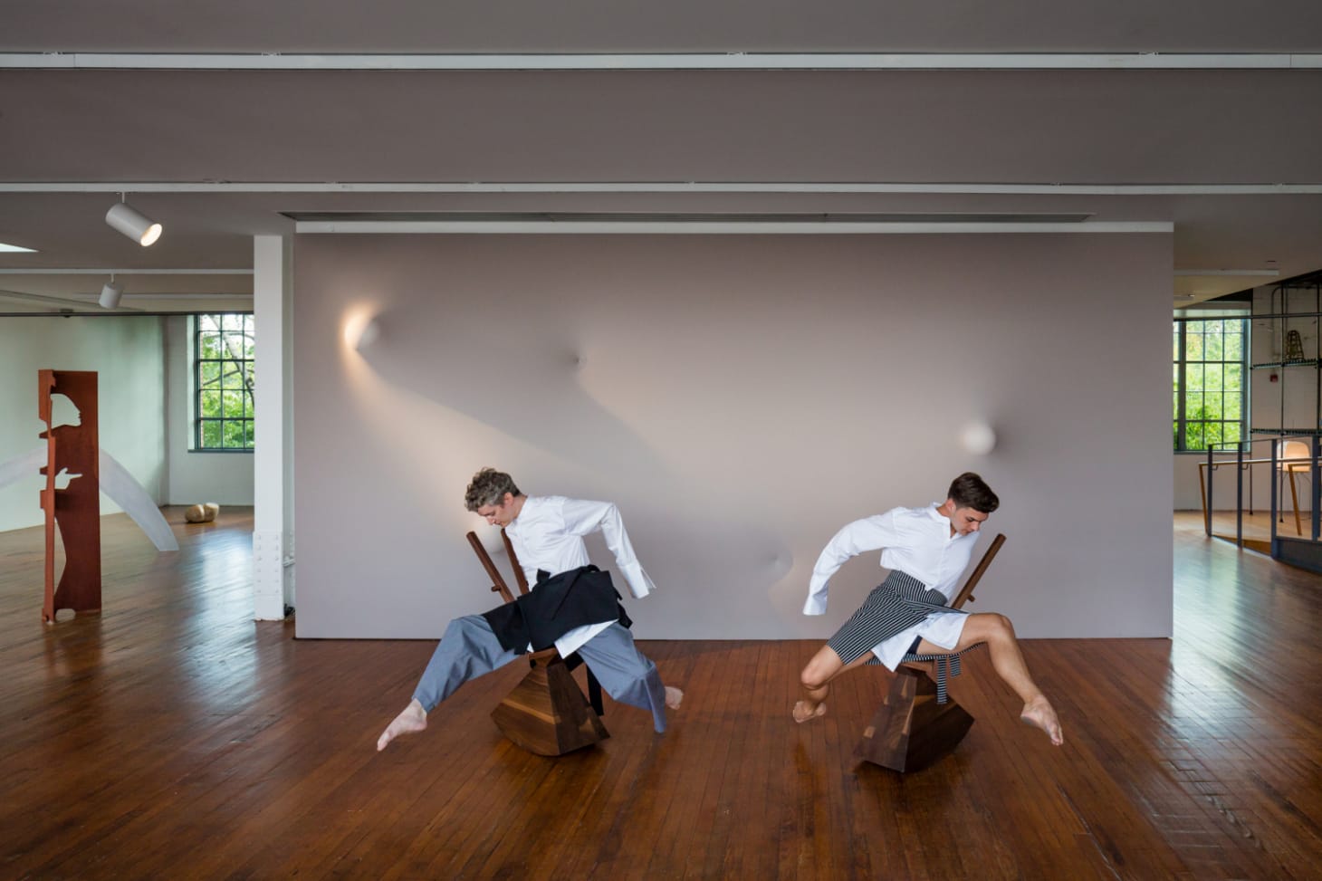 If this weren’t demanding enough, a set of “training devices” — wooden rocking chairs fabricated by Fernandes to resemble those created by Noguchi for Graham’s landmark work Appalachian Spring — figure prominently. The dancers are often balancing, their legs bent and arms extended, atop them. Both Noguchi and Graham are fitting collaborators for Fernandes. Graham believed that ballet, with its emphasis on appearing effortless, lacked drama, so she invented a form of dance that made visible the effort — and thus the passion — behind its movement, evidencing the weight and breath. For Noguchi, motion was vital to sculpture. Like Fernandes, he was interested in cultures of movement, in particular, our physical habits of being— the way we lift something off the floor, for example, or sit in a chair.
