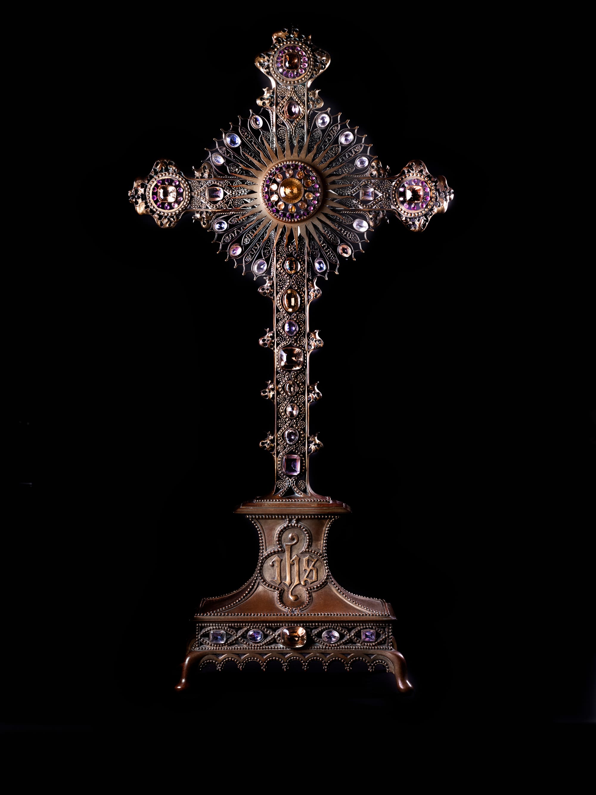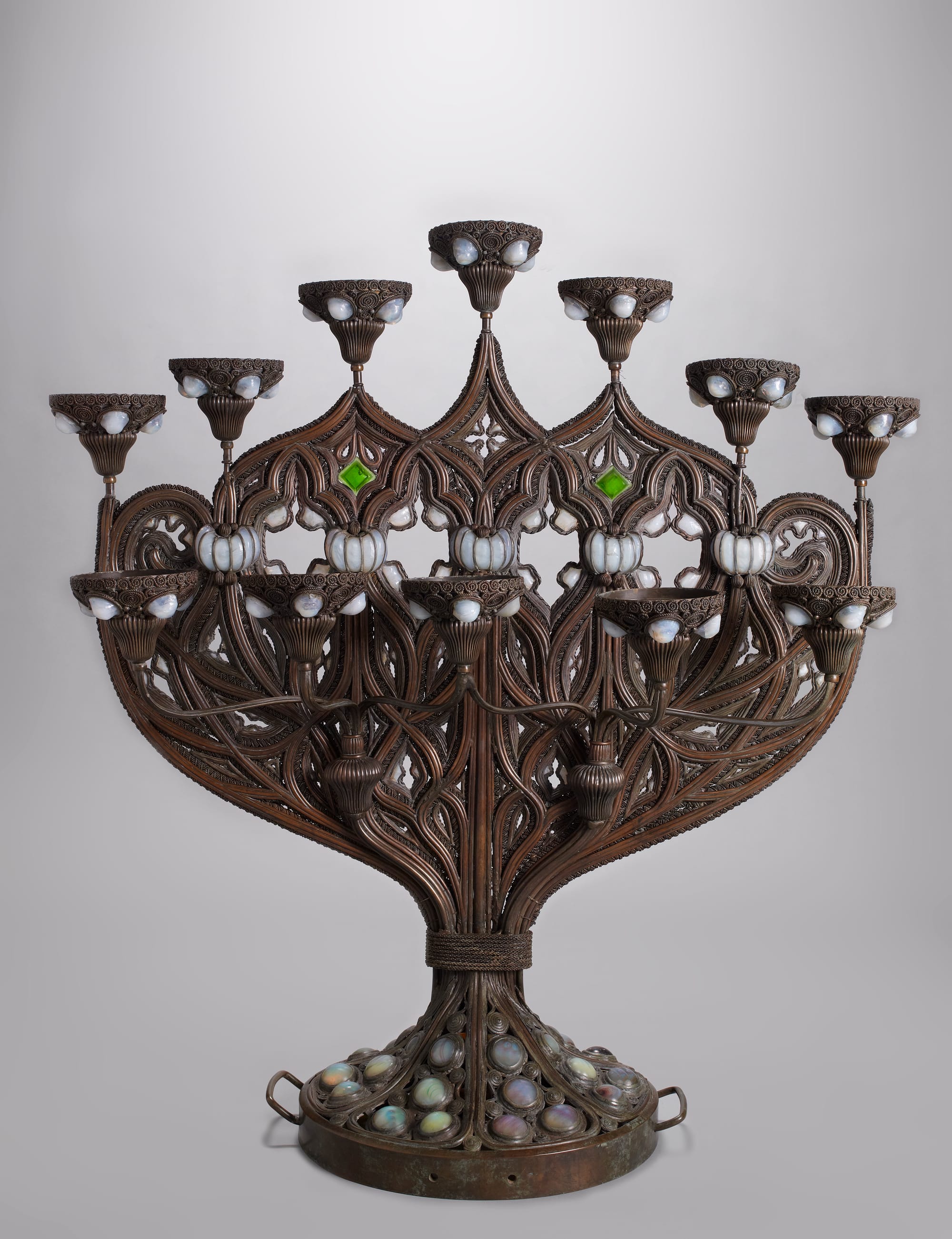 A room dedicated to artifacts from Tiffany’s exhibit at Chicago’s 1893 World’s Columbian Exhibition includes devotional objects such as a gilt brass, glass, a jeweled altar cross, and a 12-armed bronze candelabrum adorned with glass cabochons. A video display nearby documents the fate of that dazzling exhibit, which also included chandeliers and an altar. It is a sad tale of neglect, decay, and dispersal.