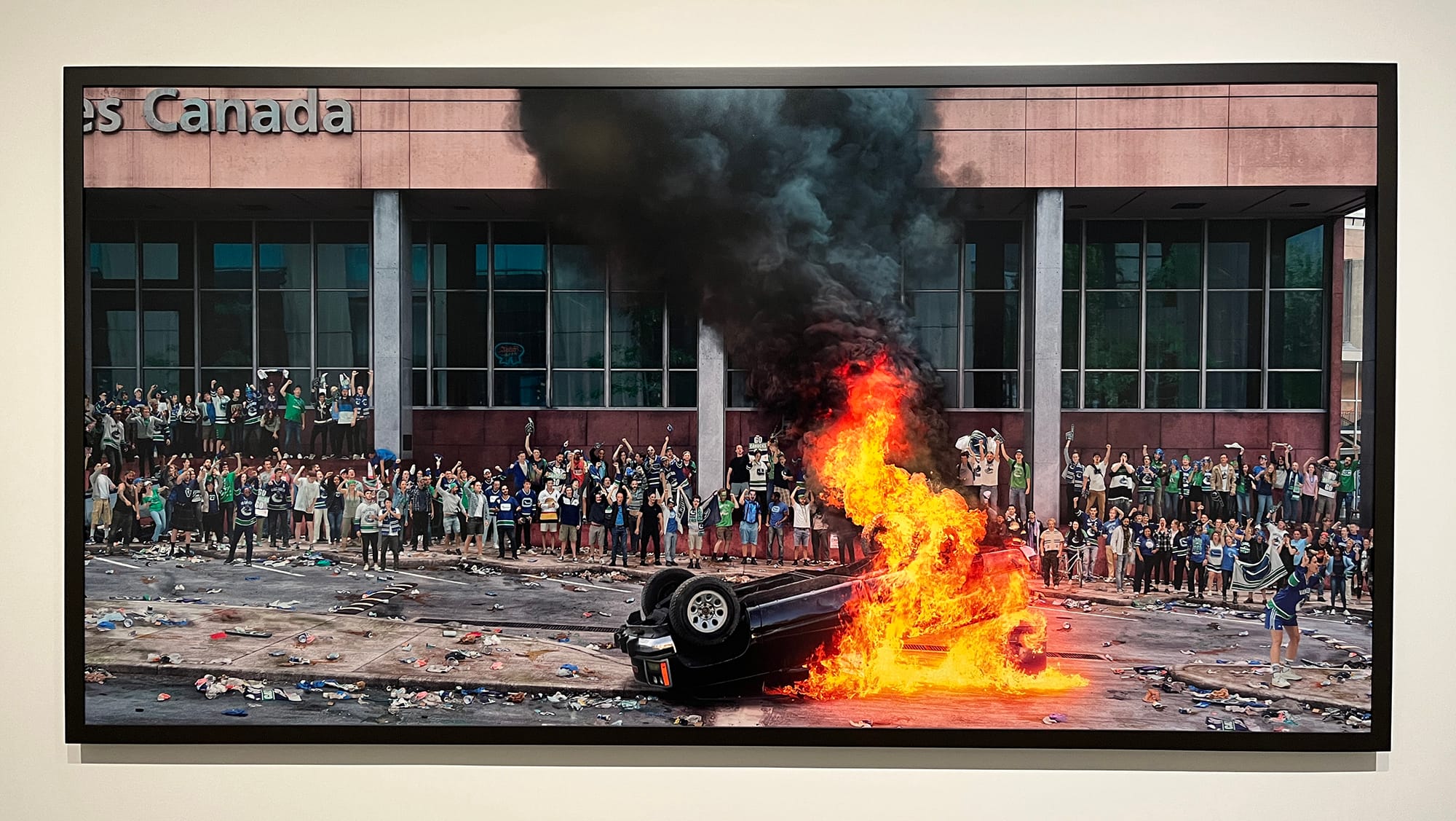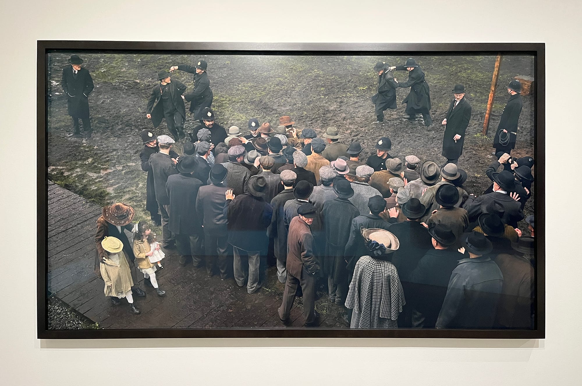 There’s so much to spend time with in Ghostlight that it’s impossible to capture it all here. But all of Douglas’s work centers on reconstructing historical moments or conjuring those that might have been, always with a Brechtian touch. Intentional awkwardness or sly references alert viewers that these are indeed artistic creations and not the “real” thing. For instance, in his Midcentury Studio series, Douglas intentionally replicates the style of photographers like Weegee, who was infamous for staging or manipulating his sensationalistic images. In his epic 2011 ≠ 1848 series, Douglas creates static simulations of upheavals that took place in 2011, such as the uprisings in Tunisia, Occupy Wall Street protesters blocking the Brooklyn Bridge, and the riot that followed that year’s Stanley Cup game in Vancouver. Through composites of elaborate staged scenes and highly detailed images of place, the artist foregrounds questions about what we can and can’t see when we receive news of these events on television or as we scroll — pushing us to think about the individuals in these scenes rather than a faceless crowd, and asking how the story might have unfolded differently.