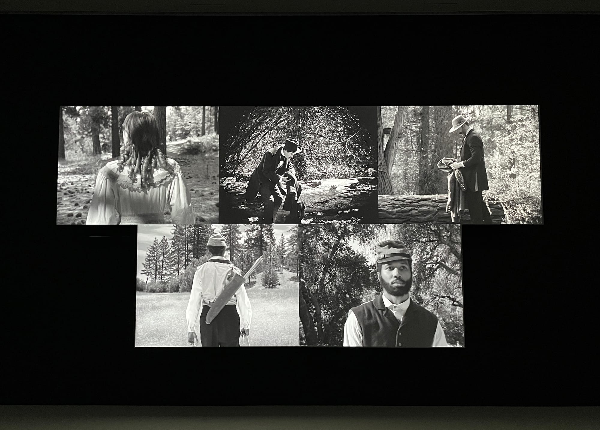 Douglas’s work focuses on a sequence known as “the Gus chase,” in which a White actor in blackface playing the character Gus asks to marry Flora, a White woman who has gone alone to retrieve water from a spring. In Griffith’s depiction, after Gus’s request is refused, he attempts to force himself onto Flora. The sequence ends with members of the KKK, including Flora’s brother Ben, lynching Gus. In the script published in the show’s catalog, Douglas describes Gus this way: “the hallucination Ben and Flora see when they encounter Sam or Tom.” Sam and Tom are characters Douglas invents, imagining what a Black man of the time might actually have been doing in the woods that day. In his multi-channel remix, Douglas surrounds the original footage with four alternate views: one from Flora’s perspective; one from her brother’s perspective; one from Tom, who is out hunting waterfowl; and the last from Sam, who does indeed propose to Flora, having met her earlier in his life. In the Sam version, the character walks away from the scene alive.