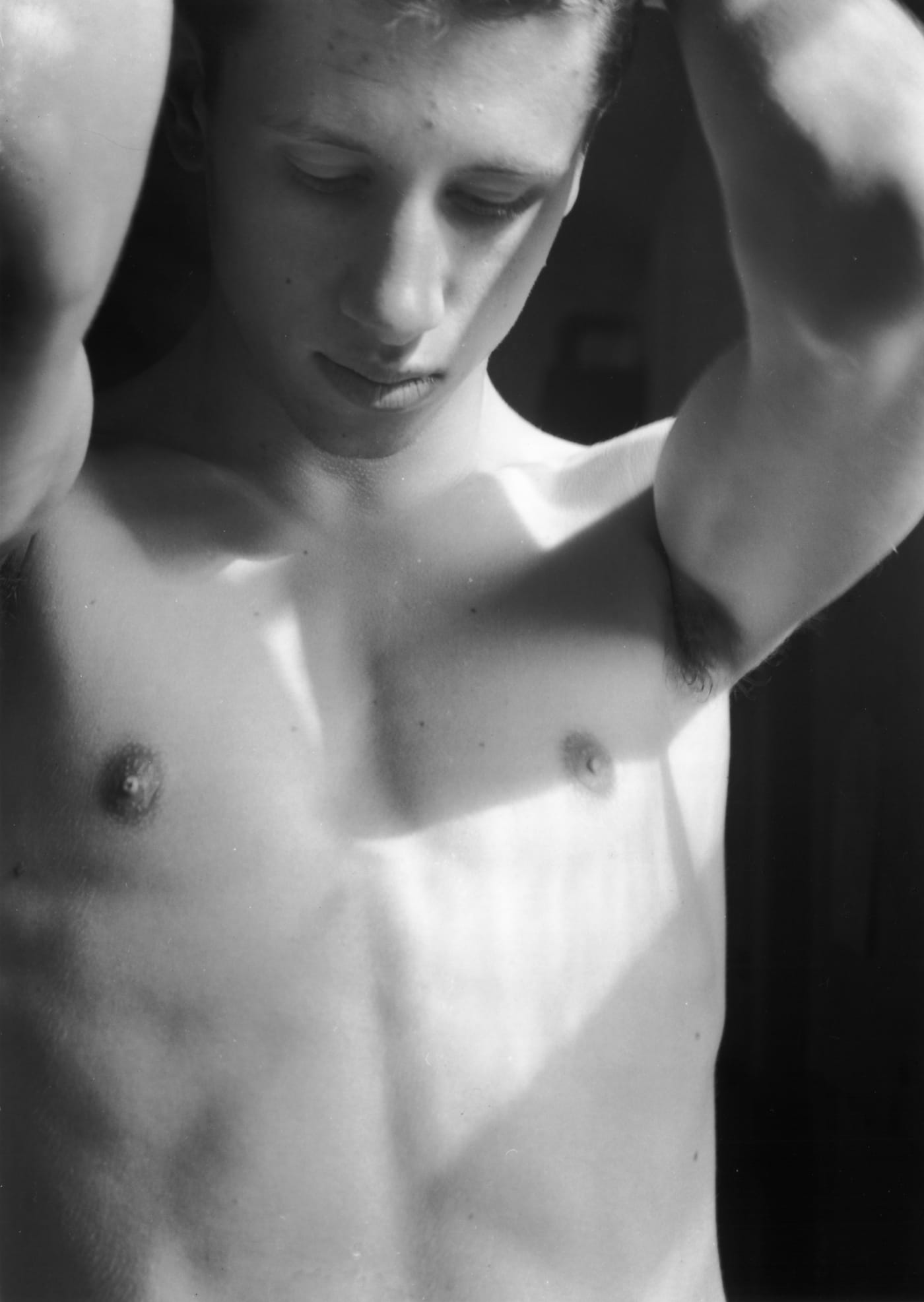 Among his films featured in this show are two untitled 1965 collaborations with dancers; these were eventually used as projections accompanying Variations V, a multimedia performance project by Cage, Cunningham, and David Tudor. In one — with the privileged access that only film or physical intimacy can offer — we see up close Cunningham’s gloriously gnarled feet and watch him move like an animal, graceful and frantic, across his rehearsal room.