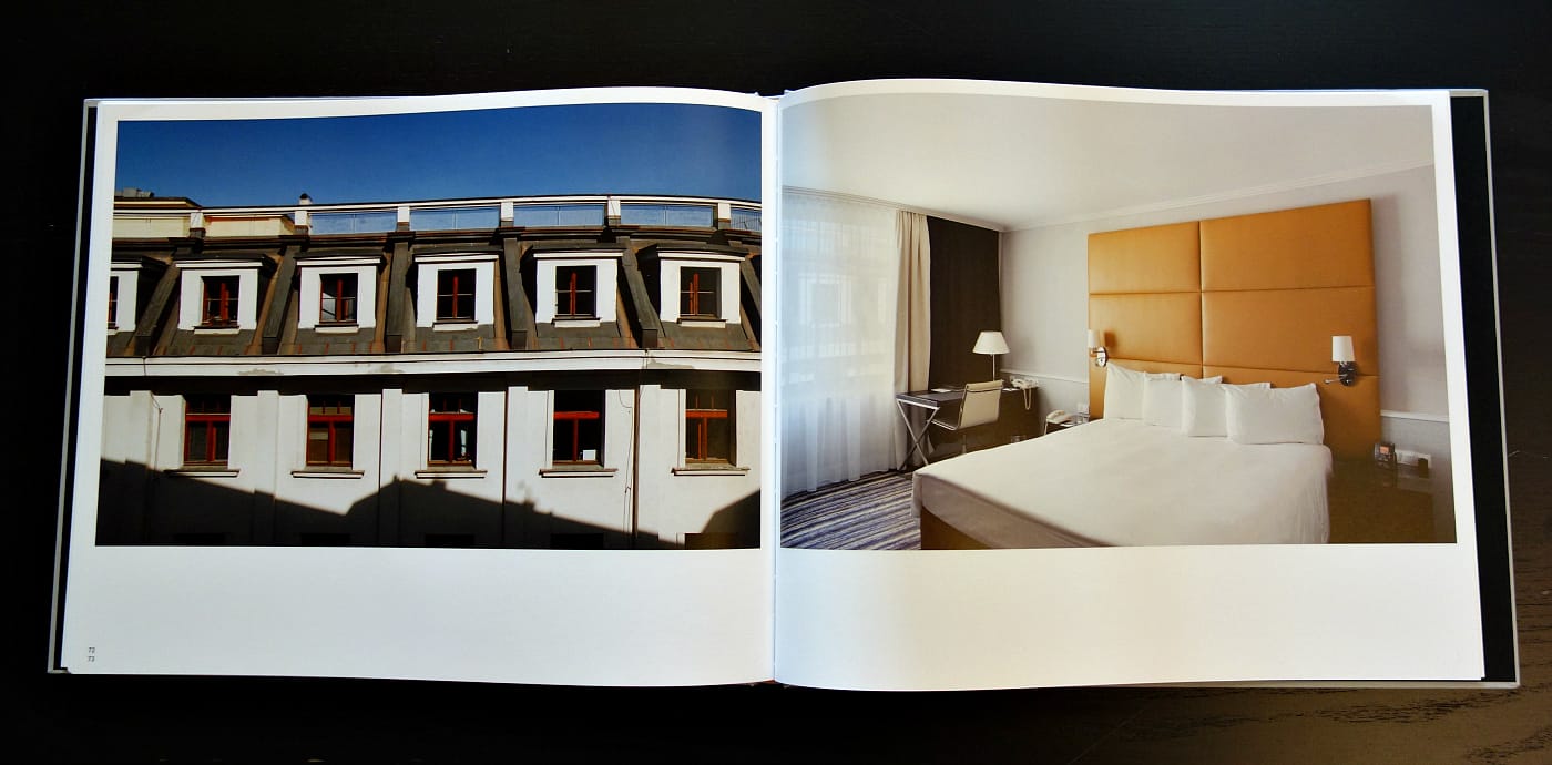 The Standard book follows previous photography projects by Eberhard on the nature of hotels. His Shanty Town Deluxe featured fuzzy Polaroids of a luxury hotel in South Africa that uses poverty as a gimmick, while Aussicht explored the window views and exterior of the Citadel Inn resort in Western Ukraine. That hotel was used as a World War II concentration camp, yet there is no plaque or memorial to share that history with visitors. The typology of the hotel room is one of anonymity, a uniformity that gives all of these places a sense of untouchable stillness in their temporary comforts.