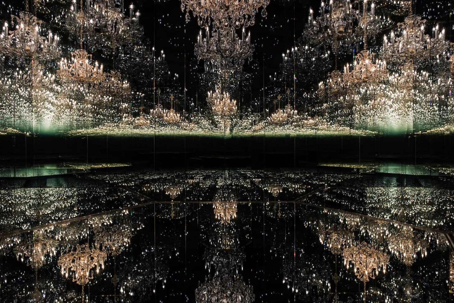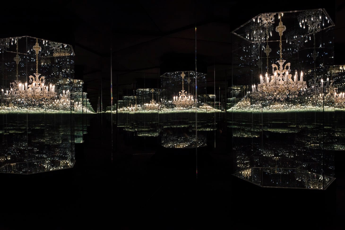 It is only when I begin to walk ahead and try to touch the walls — and you do not really want to do this because it is never really clear how, or even where, you can proceed — that I finally understand that there is only one chandelier, and that all the rest, all this infinite replication, is an extravagant, room-engulfing trick of the light.