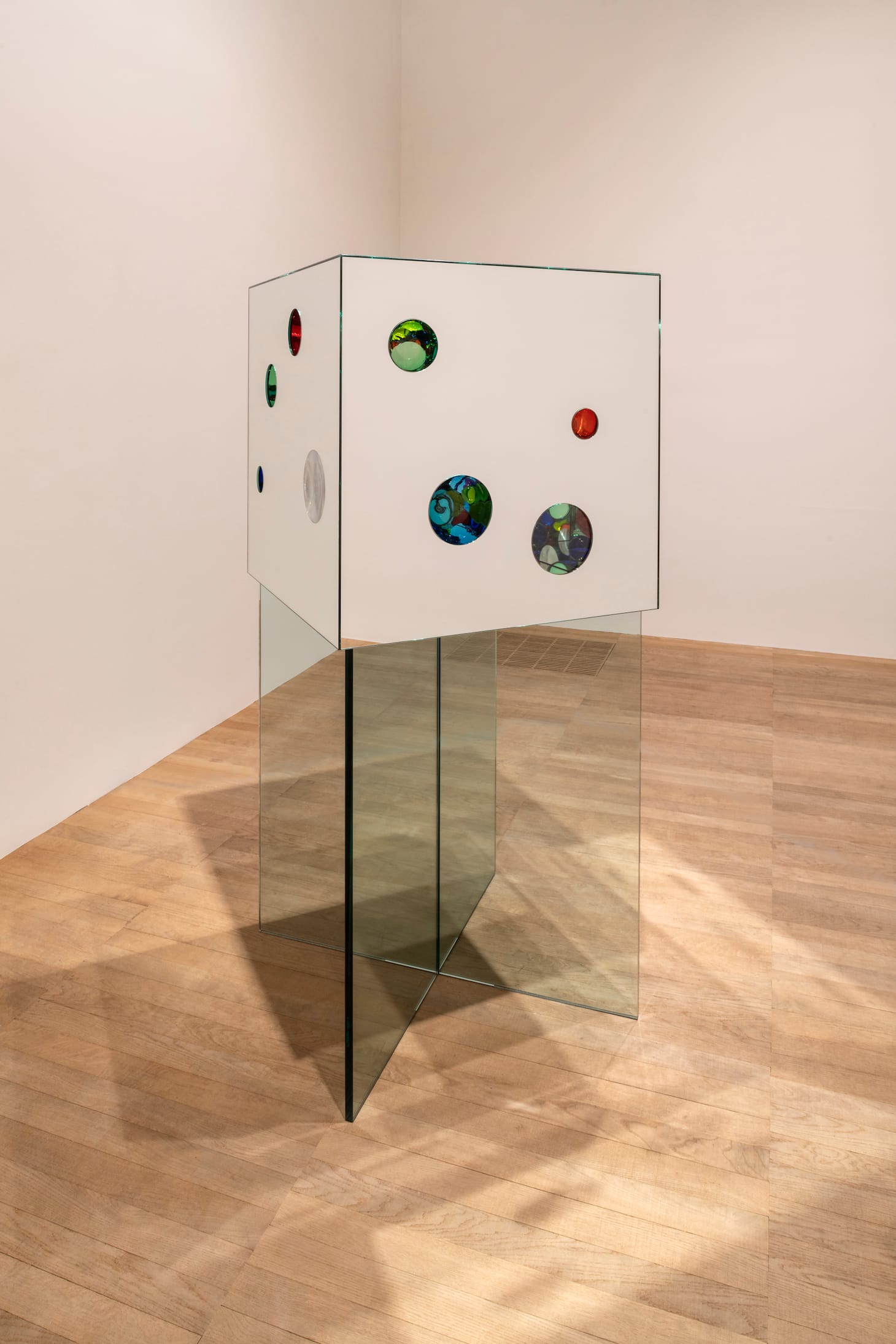 Inside you find yourself standing in a seemingly infinite space, lit by a single chandelier enclosed within a glass polygon. The chandelier gently turns and turns, its light flickering. The walls of the space are covered with mirrored panels, cunningly angled so that you do not know quite how many enclosed chandeliers there really are. There could be many — but then there could be many of you too, because you too are forever receding into the distance.