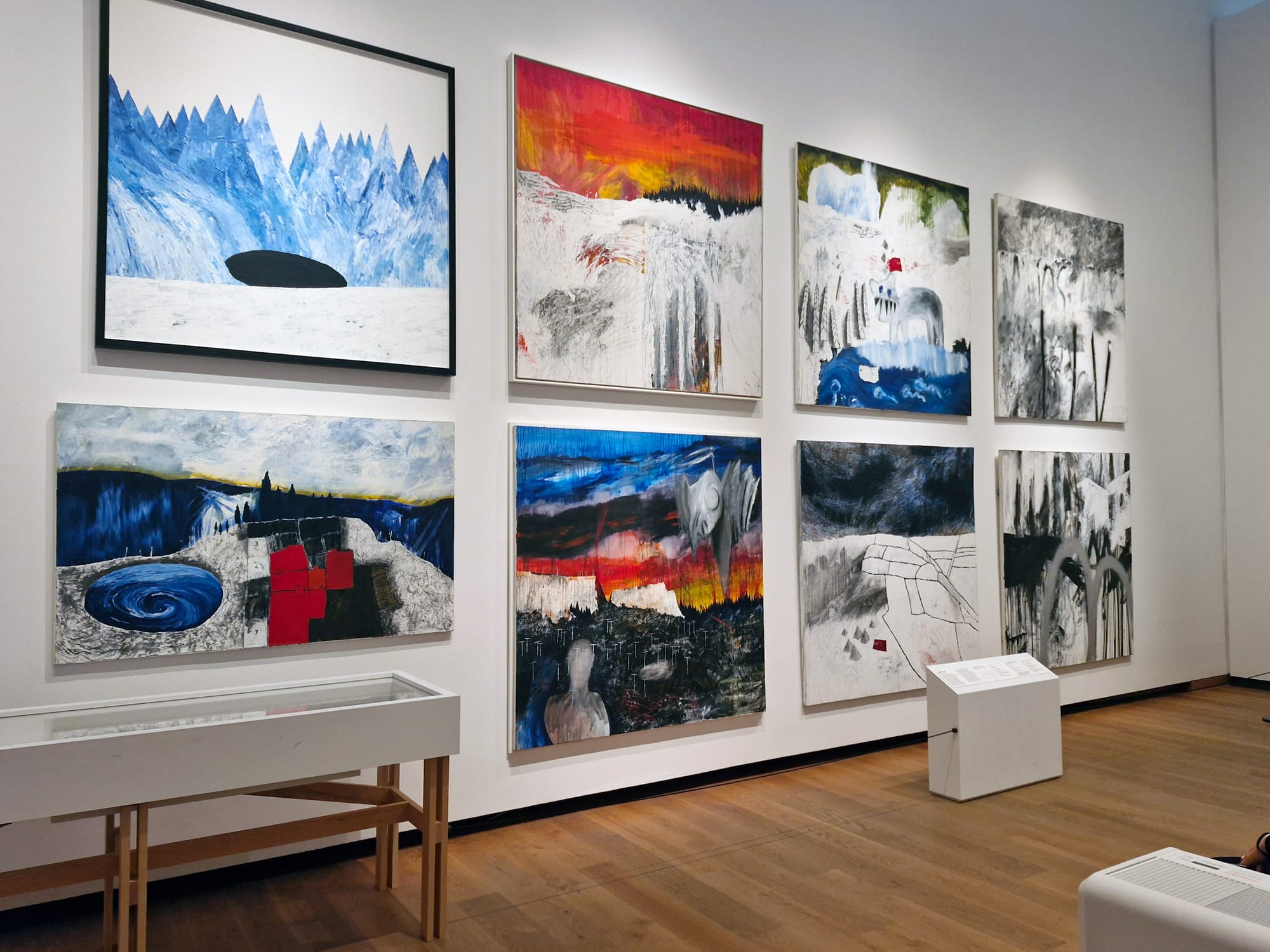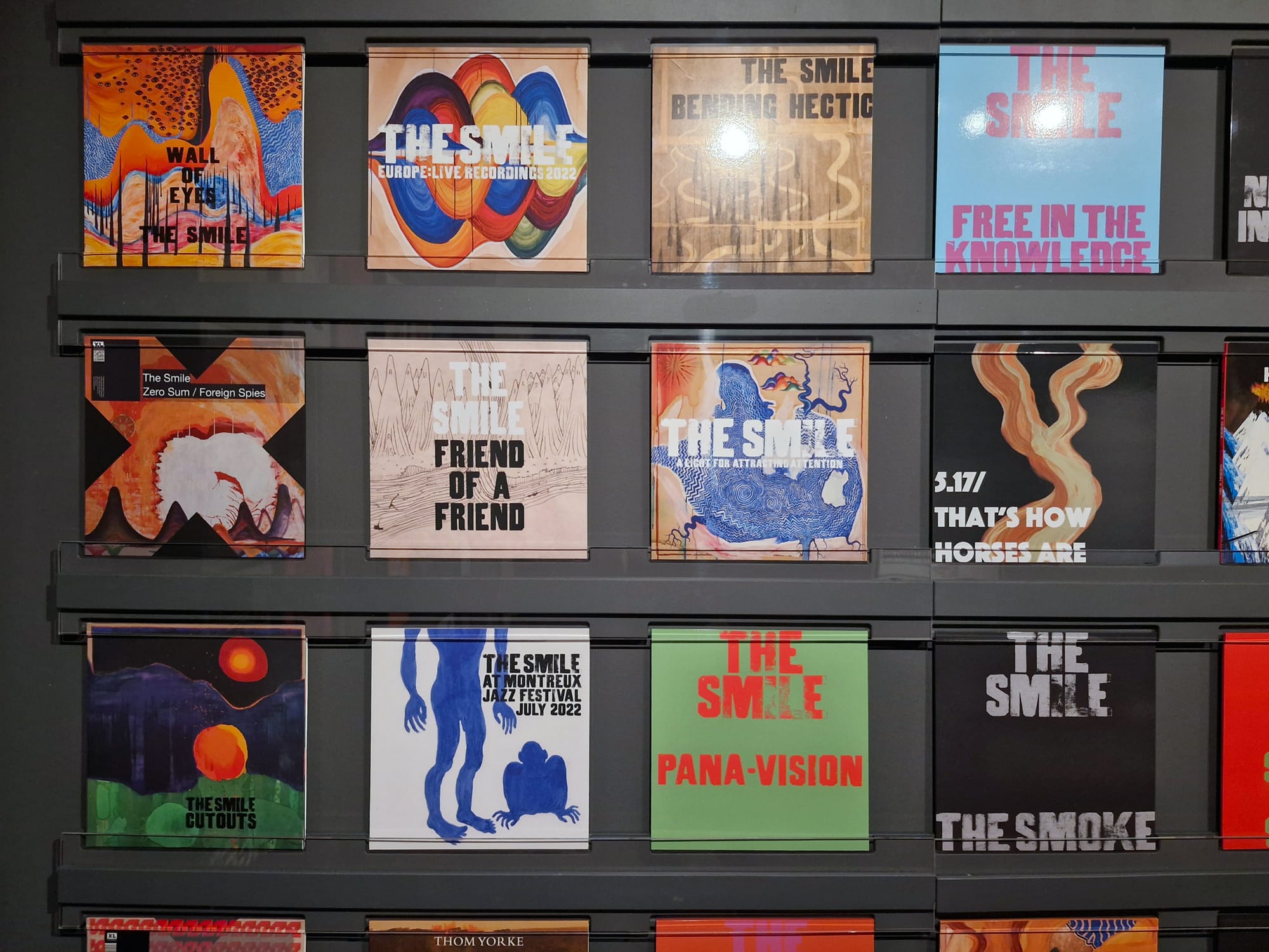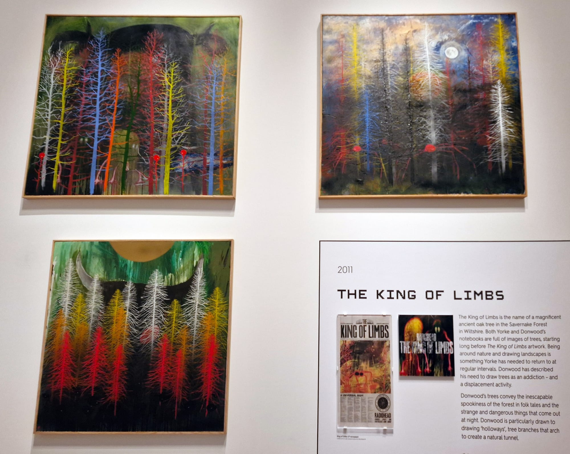 What will non-fans make of the artwork, which can be by turns playful, nihilistic, anti-commercial — all recurrent strains in Radiohead’s music? Again, it is the music — specifically the lyrics — that the visuals grow in tandem with; without it, one may look at the gloopy enamel swirl for Moon Shaped Pool’s (2016) cover “Wraith” (2015) and see, well, a context-less moon-shaped pool. Similarly, we are told that the King of Limbs’s (2011) artwork originates from a huge oak tree in the Savernake Forest in Wiltshire; yet there is a wealth of further meaning behind the accompanying pictures of densely packed and colorfully painted trees that a non-listener is lacking. The music and images exist as one half of the other, meaning those unfamiliar with the former automatically miss out to some degree. For the majority of visitors, however, this will be essential viewing alone just to see the original version of the album covers in person on the walls, like some kind of pilgrimage. With legions of fans behind them, this is art that has been given a free pass that many artists can only dream of.