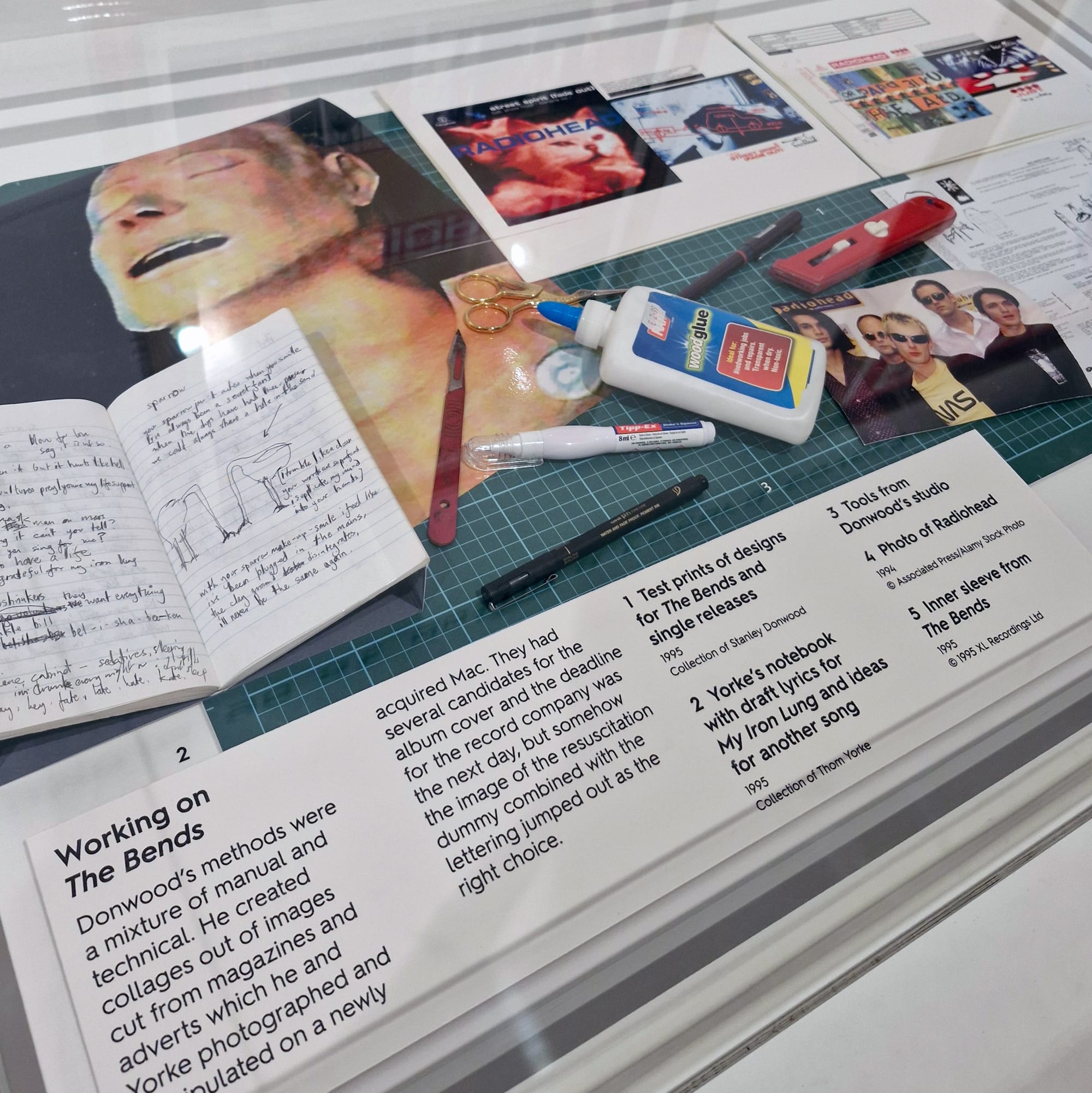 OXFORD, United Kingdom — Radiohead, the 30 million records-selling, culturally iconic, yada yada English rock band, needs no introduction — though the hagiographic press release of This Is What You Get, an exhibition about the extensive artistic output accompanying their music career at the Ashmolean Museum of Art and Archaeology, takes pains to do so anyway. Stanley Donwood, however, does need some introducing. Over 30 years, the artist worked closely in collaboration with frontman Thom Yorke as the latter made his music. Sketches, collages, and notebooks on display detail an ongoing visual dialogue between the pair, and chart how the look and feel of album covers took shape before being presented to the record-buying public. Fans will surely salivate over the opportunity to see these real-time working methods as much as the rare vinyls lining the introductory room walls, handwritten lyrics for “Karma Police” (1997), and the original album cover artworks themselves.