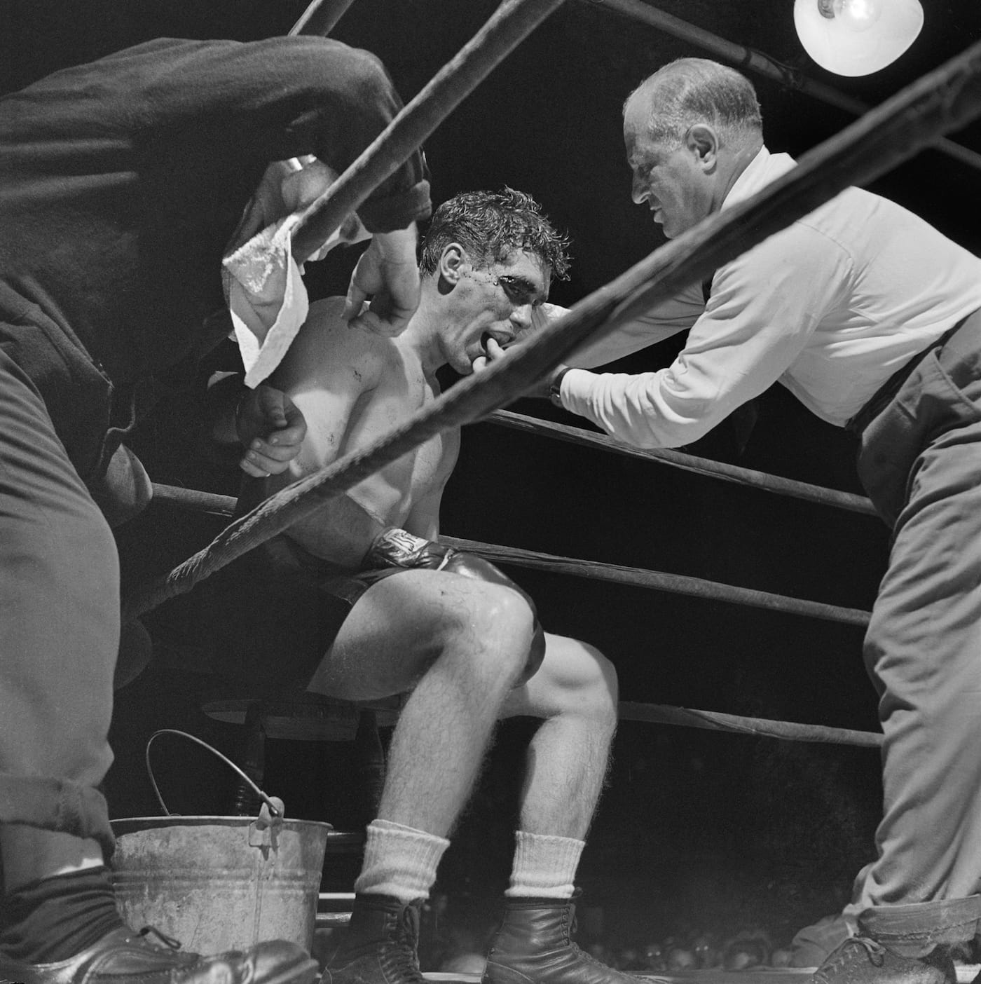 Two years later, on January 18, Look published the essay “Prizefighter,” an important Kubrick work. With their dynamic chiaroscuro lighting, the pictures in the article show his maturation as a photographer and storyteller. The titular prizefighter is Walter Cartier, a 24-year-old middleweight boxer who lived in Greenwich Village (where Stanley also resided at the time with his first wife, Toba Metz). The article follows a day in the life of Cartier as he prepares for a match with his manager and twin brother: eating with his family, training with his manager, praying at church, and more. “Prizefighter” is also a transitional work, for Kubrick would return to Cartier for his first film, the self-financed, 16-minute Day of the Fight (1951). Kubrick would recycle imagery from “Prizefighter” and his article on nightclubs for both the short and his second feature film, Killer’s Kiss (1955). The exhibit includes looped clips from the two films, presenting them with the corresponding photos that Kubrick borrowed from.