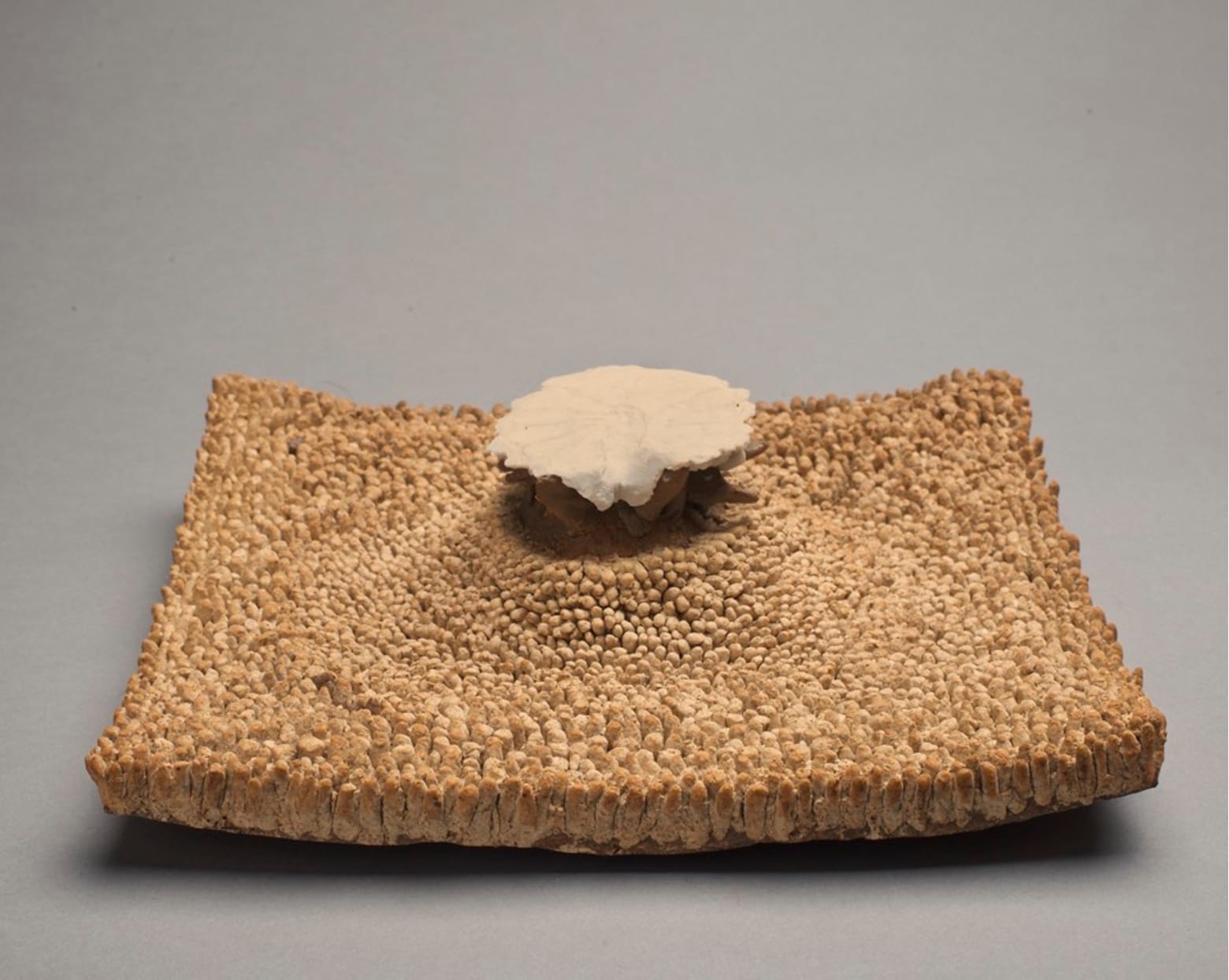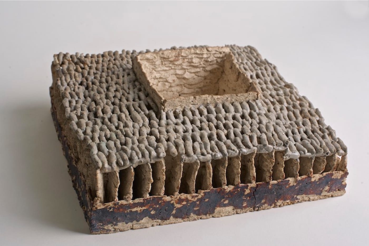Rosen never lets you forget that you looking an object made of pieces of clay, but he doesn’t emphasize it either. One piece, measuring only 3 by 8 by 9 inches, might remind you of a section of piled carpet — a field of vertical coils on a slightly arched bed, with a mushroom-like abstract form in the middle.