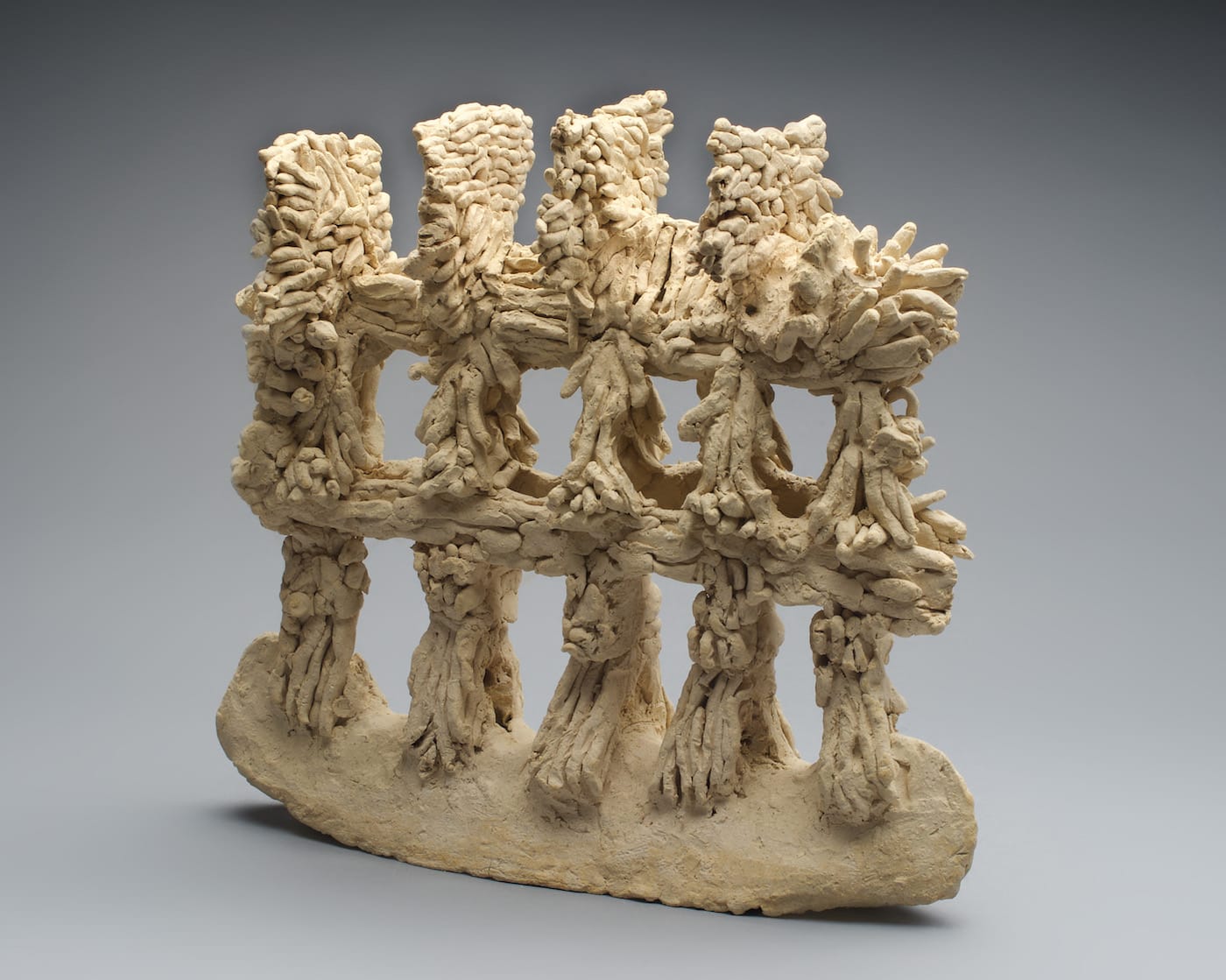 None of the more than a dozen sculptures at Steven Harvey Fine Arts Projects is higher than twenty inches. They are made of stoneware that is often unglazed: the colors are earthy – grays, tans, dirty whites, dark browns – and might remind you of different kinds of bread. In all of the work there is a dialogue between the visual and the visceral.