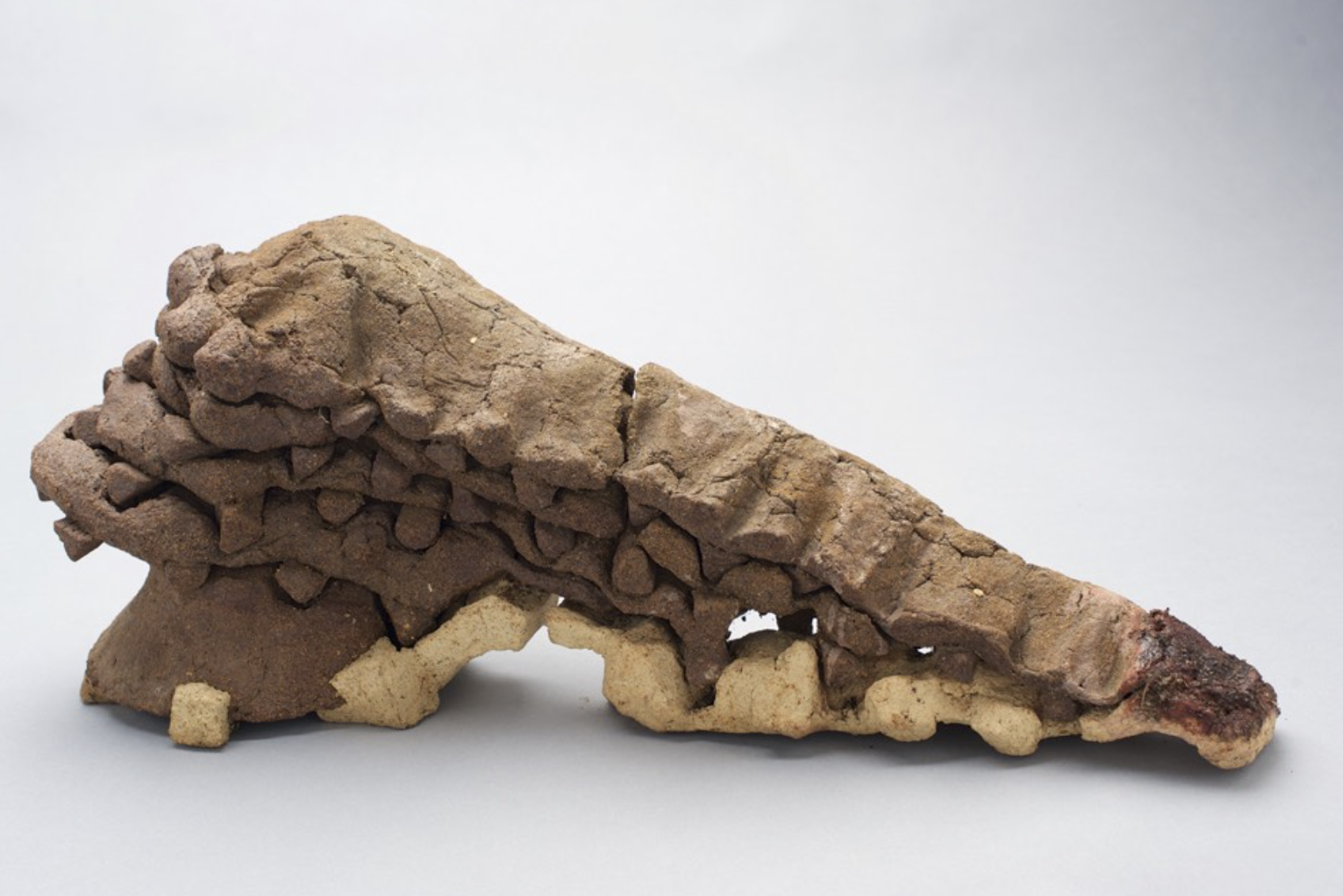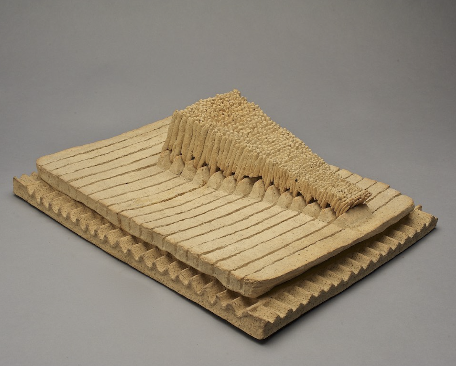 In the unglazed stoneware sculpture “Untitled” (1980s), hundreds of tiny pinched coils are packed together within grooves. They form a triangle that resembles an abstract restating of an alligator’s lower jaw or head within the context of this exhibition. This piece sits atop two flat, stacked layers, one accented with parallel lines, the other with grooves.