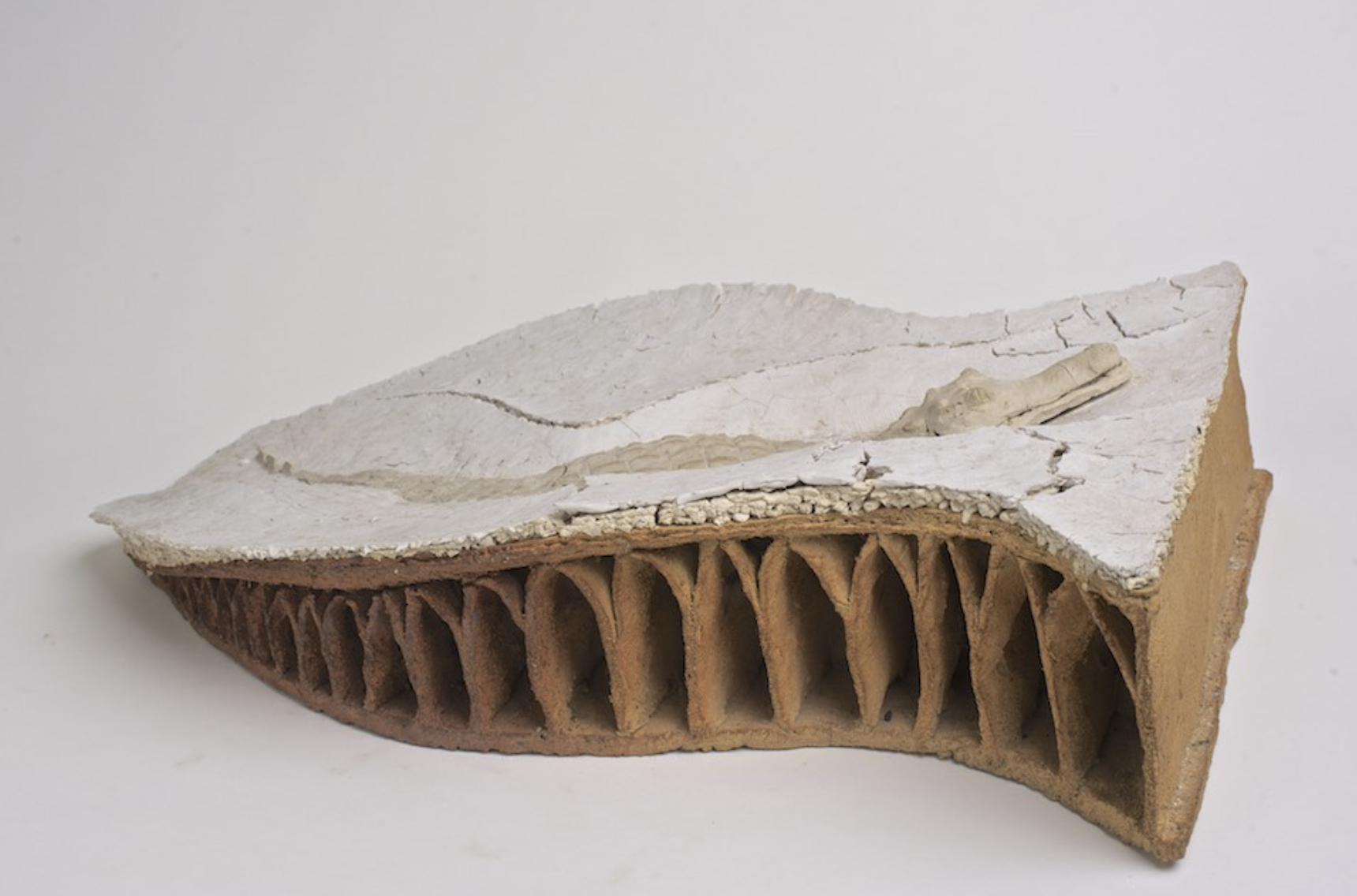 While none of the works are particularly large, the internal scale changes, defined by the specific subject, such as an alligator resting in mud or a jaw. Consistent throughout his iterations of an alligator is his ambition to connect the shaping of clay with prehistoric visions, to make ceramics that have not lost their identity as baked mud.
