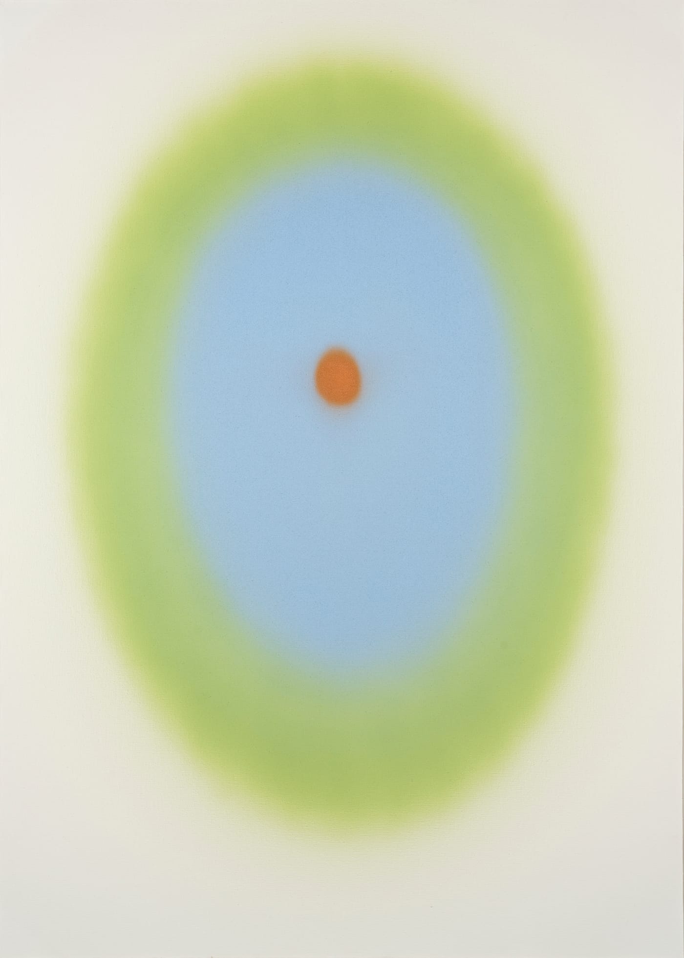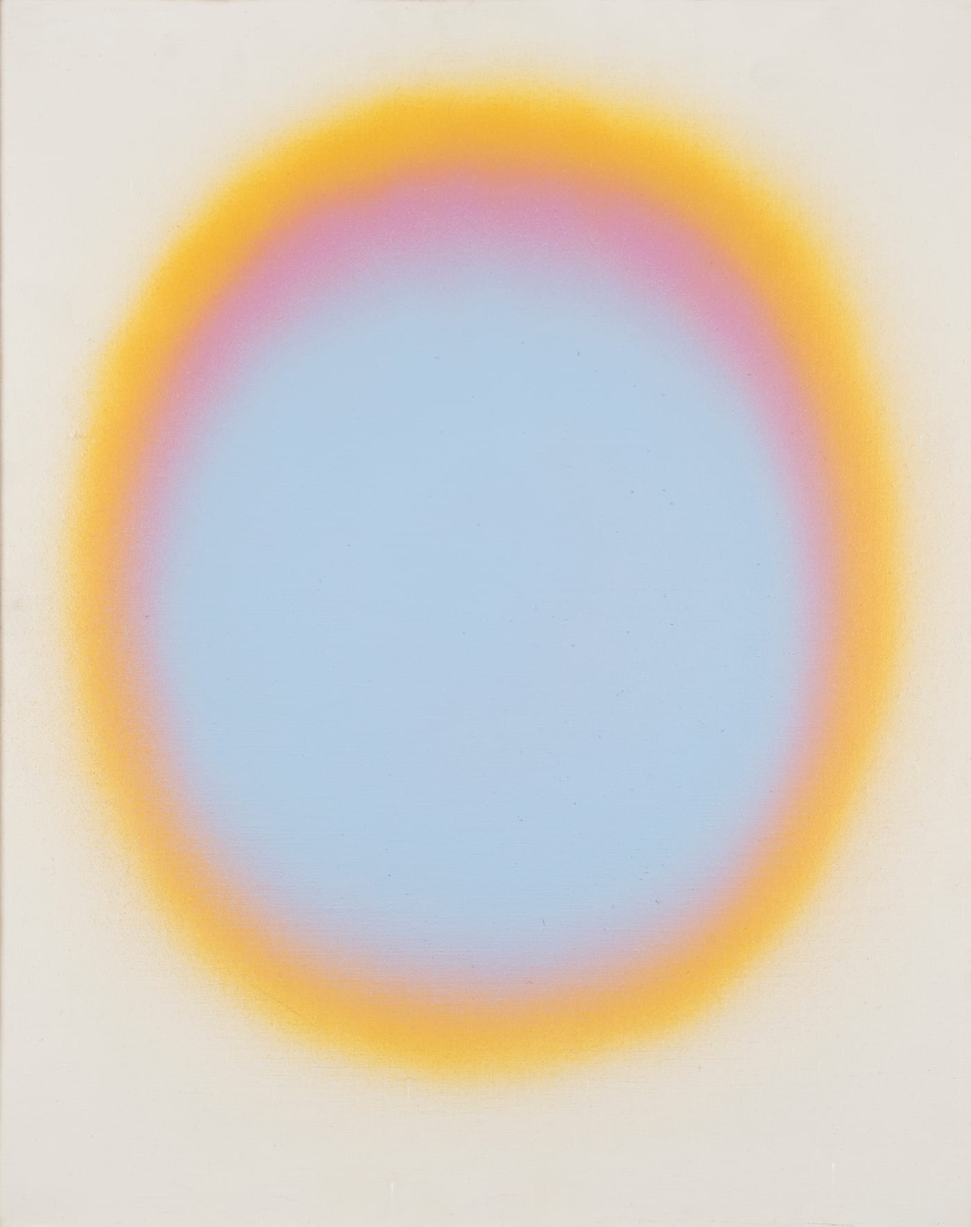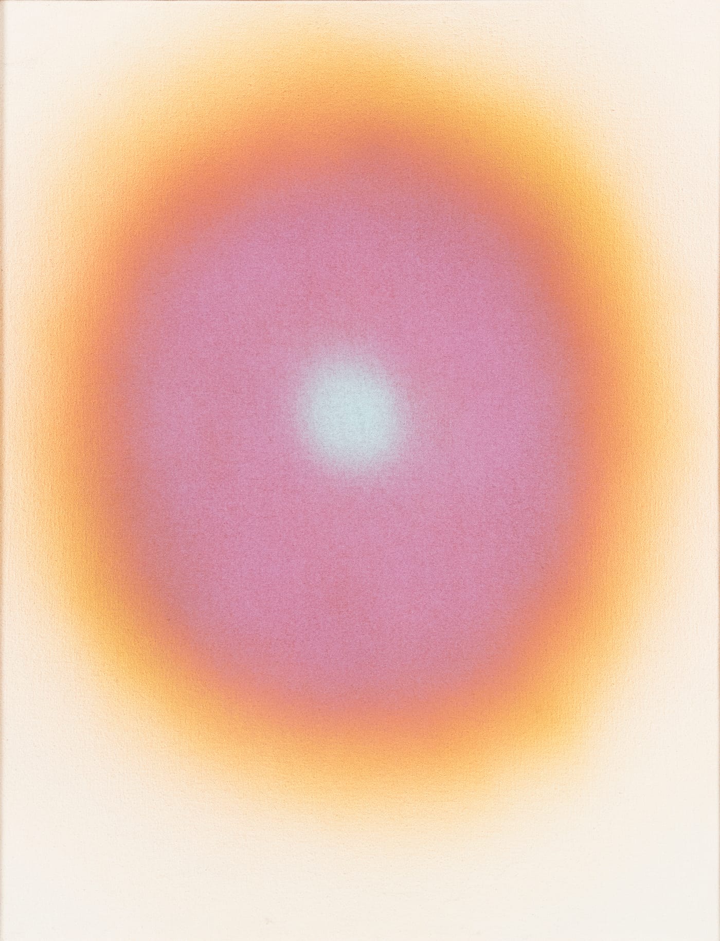 In the film Stanley Twardowicz — 1987 Documentary, which can be seen on YouTube, the artist, in a conversation with Peter Plagens, says that he is painting with feeling, and that “feelings have no shape.” In the Ovals, as he called them, he arrived at a shape that was dispersing. With its concentric bands, and the paint’s fog-like presence, the viewer is both pulled in and held at arm’s length — an interesting visual tension