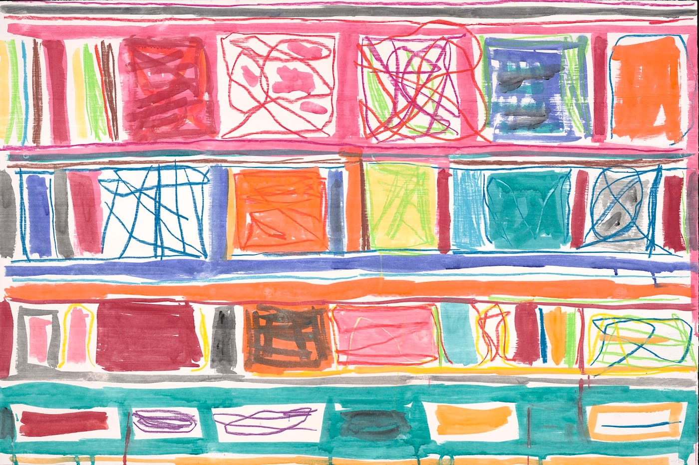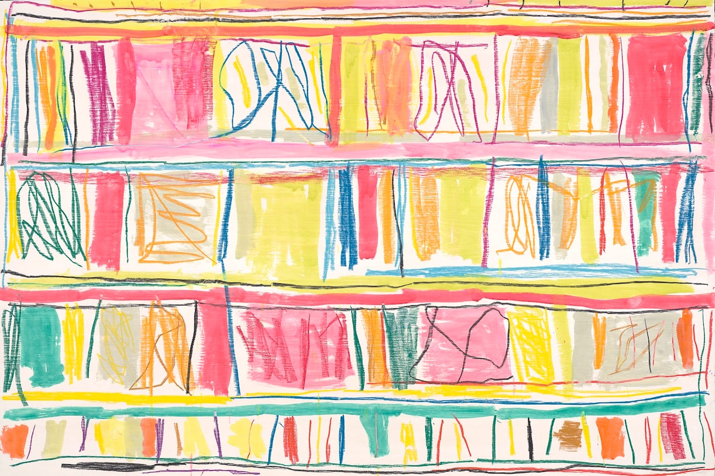 In the large, horizontal monotypes, which measure 48 x 72 inches, Whitney divides the surface into four horizontal bands, as he does in his square-format paintings. He uses watercolor and crayon to carve the horizontal bands into a succession of rectangles. When he applies a color inside the rectangle, he doesn’t completely fill the white space. There are places where the color bleeds, and others where he has gone back into one color with a darker version of the same color. He also uses the crayon to draw lines over the rectangle. The horizontal format compels us to read these elements differently than we do in the square formats encountered in his paintings, while the looping, scribbled lines evoke his work from the 80s and early 90s.