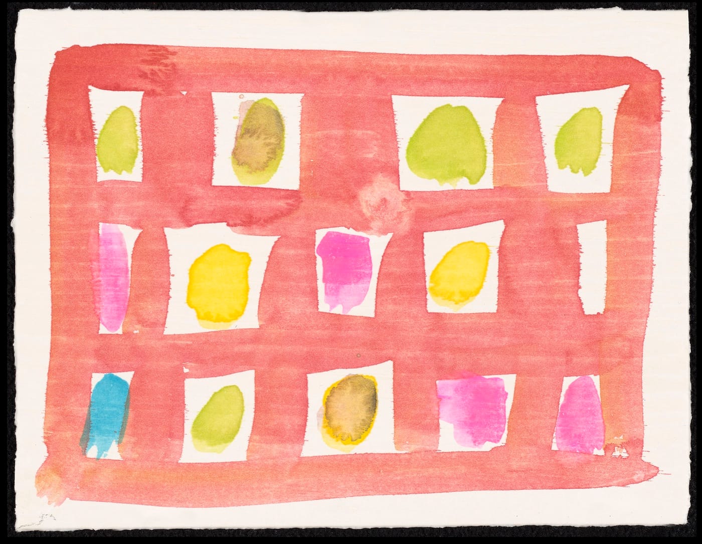 In one of the small monotypes I saw at the studio, Whitney painted a loosely brushed ground of watermelon red in which he set three horizontal rows of unpainted, irregularly shaped rectangles, squares, and trapezoids, four in the top row and five in the middle and bottom rows. Within all but one of the rectangles Whitney laid a brushstroke or two of color, like a fingerprint, ranging from yellow to greenish-yellow to turquoise blue and magenta. Sometimes the color sits inside the confines of rectangle, other times it extends beyond. The wood grain pattern is visible in the watermelon-colored ground. There is no predetermined pattern to the colors he places within the irregular white rectangles. Structure and improvisation have become inseparable. Whitney, who has long stated that he is a process painter, has never settled into a mechanical approach: the hand is always involved, even if that is not immediately evident. In these works, which are slight in scale, the artist’s touch is evident without calling attention to its presence. Whitney has never been a theatrical artist.