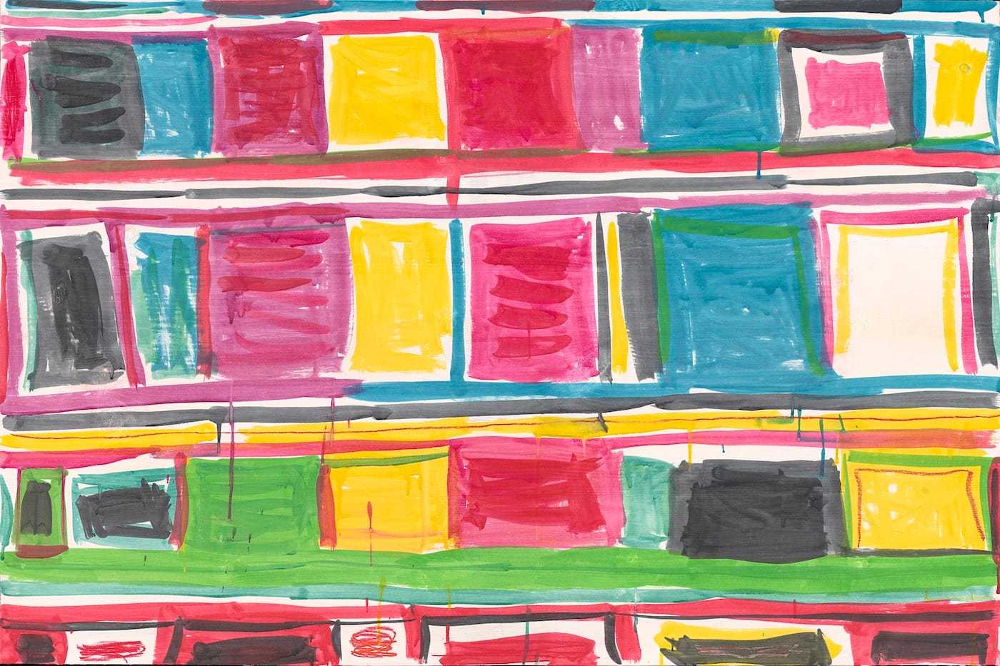 The one constant running through all of my writing on Whitney is his works on paper, which I am thinking about in the broadest sense — from the densely linear graphite concatenations he made in the late 1980s to the gouaches in fruity Popsicle colors from the past few years. It is clear to me that Whitney’s works on paper form a distinct body within his oeuvre, and that within this group he has gone down a number of different paths in his exploration of lines, grids, colors.