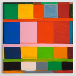 For a number of years, Whitney has divided his paintings into four differently- sized, horizontal bands with the smallest band at the bottom. He fills these bands with between five and seven vertical rectangles of monochromatic color. Because he separates the wide horizontal bands with one or two narrow ones, each a single color, that run the width of the painting, the large bands resemble friezes made up of variously colored panels.