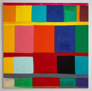 At the same time, the four narrow bands work in counterpoint to both the horizontal rows and the individual rectangles. The third row across is pale yellow, for example. Located slightly below the middle of the painting, the yellow band calls attention to the large dark blue rectangle (one of the largest in the painting) and the slightly lighter blue rectangle below it. This tonal shift is echoed in the turquoise rectangle one unit over from the blue pairing.