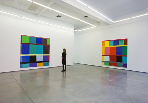 We might start out by reading the paintings from left right, following the sequence of colors within a band, or by looking up and down, or all over, our attention leaping around the canvas. This is one of their strong points — they define different ways of being read (paid attention to) without becoming didactic.