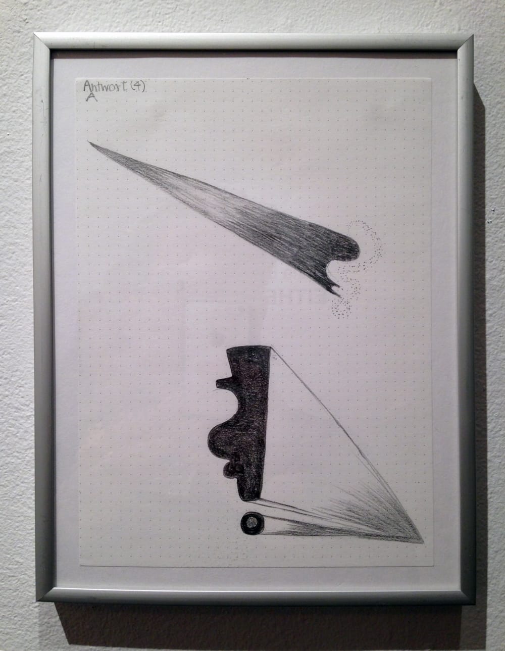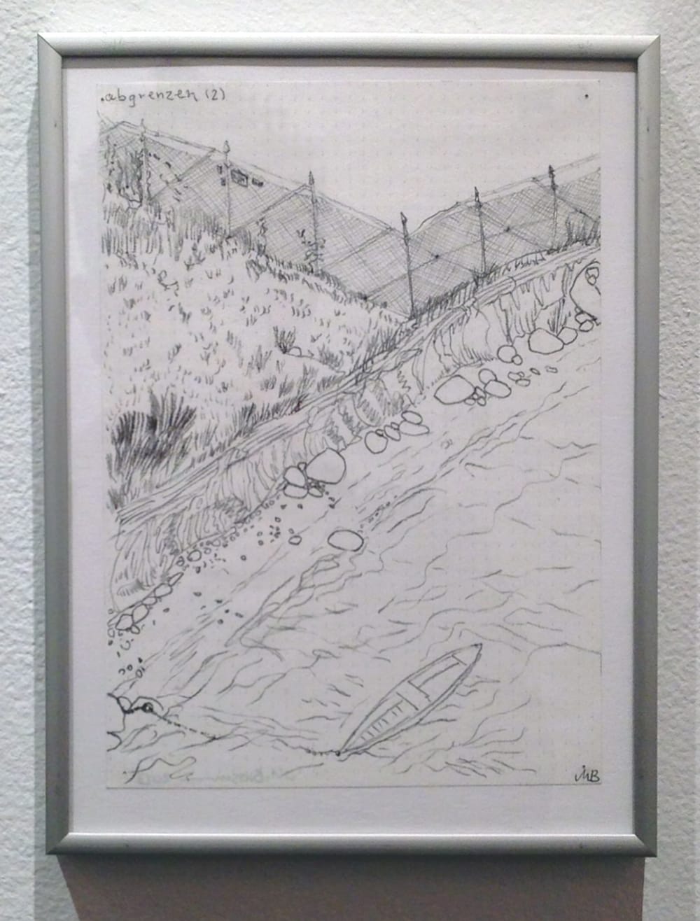 Conversely, she veers toward complete abstraction in “Antwort” (“answer”), in which a flat, blade-like shape points to the top left corner, while beneath it a form resembling a crown molding recedes in deep perspective into the bottom right. In other works, the picture seems to simultaneously acknowledge and contradict the word, as in “abgrenzen” (“delimit”), where a cyclone fence near the top of the sheet is all but lost in a detailed landscape dominated by a riverbank, where a moored canoe bobs in the water — signifiers of freedom and escape.