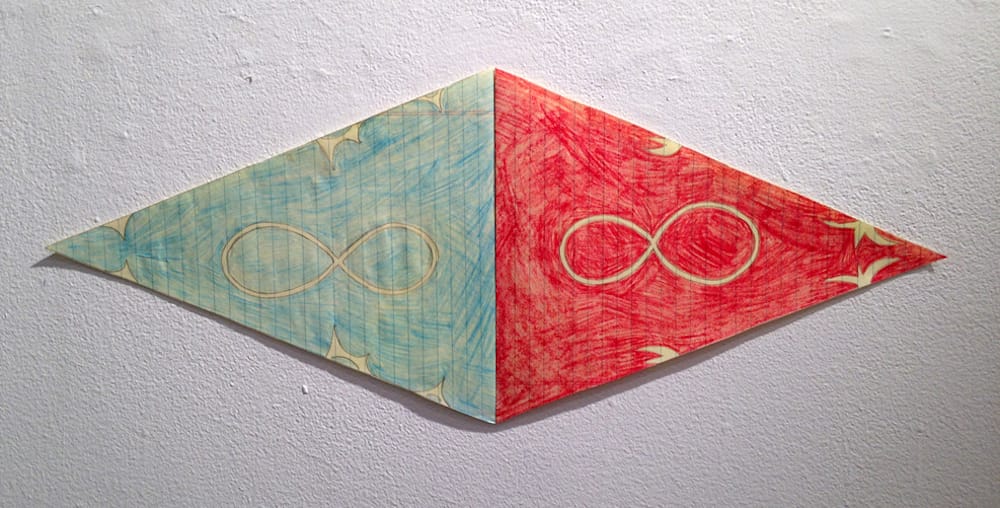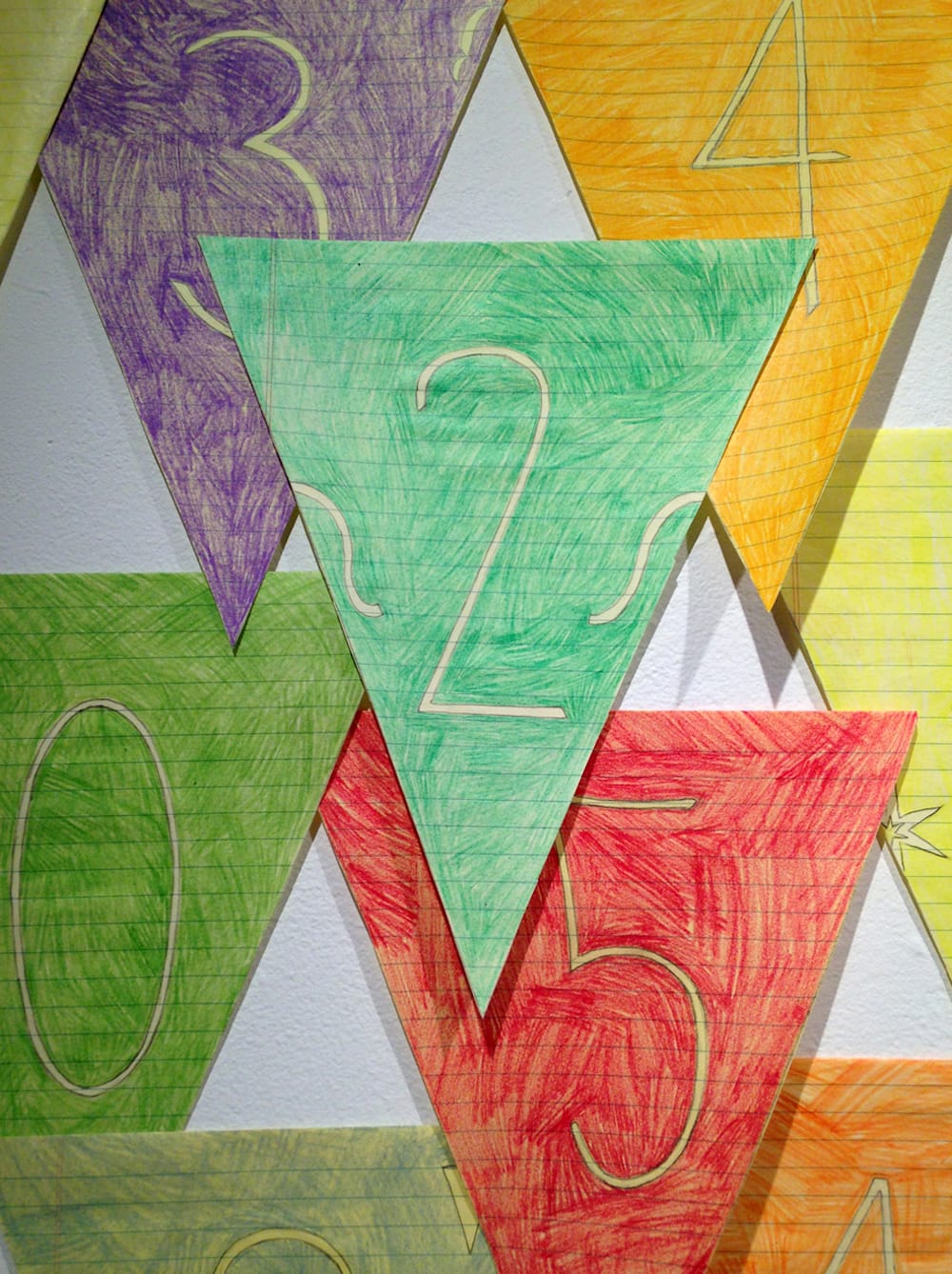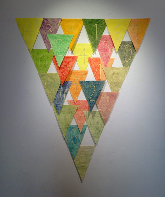 The Lucky Numbers are triangular drawings, resembling pennants, done in colored pencil on the same lined flip chart paper that she used for her series Drawings Dedicated to Hannah Arendt, which were shown at the Deutsches Haus at New York University in 2012. The pennants are considered individual artworks, but they can be grouped, as sculptural objects, in endless configurations.