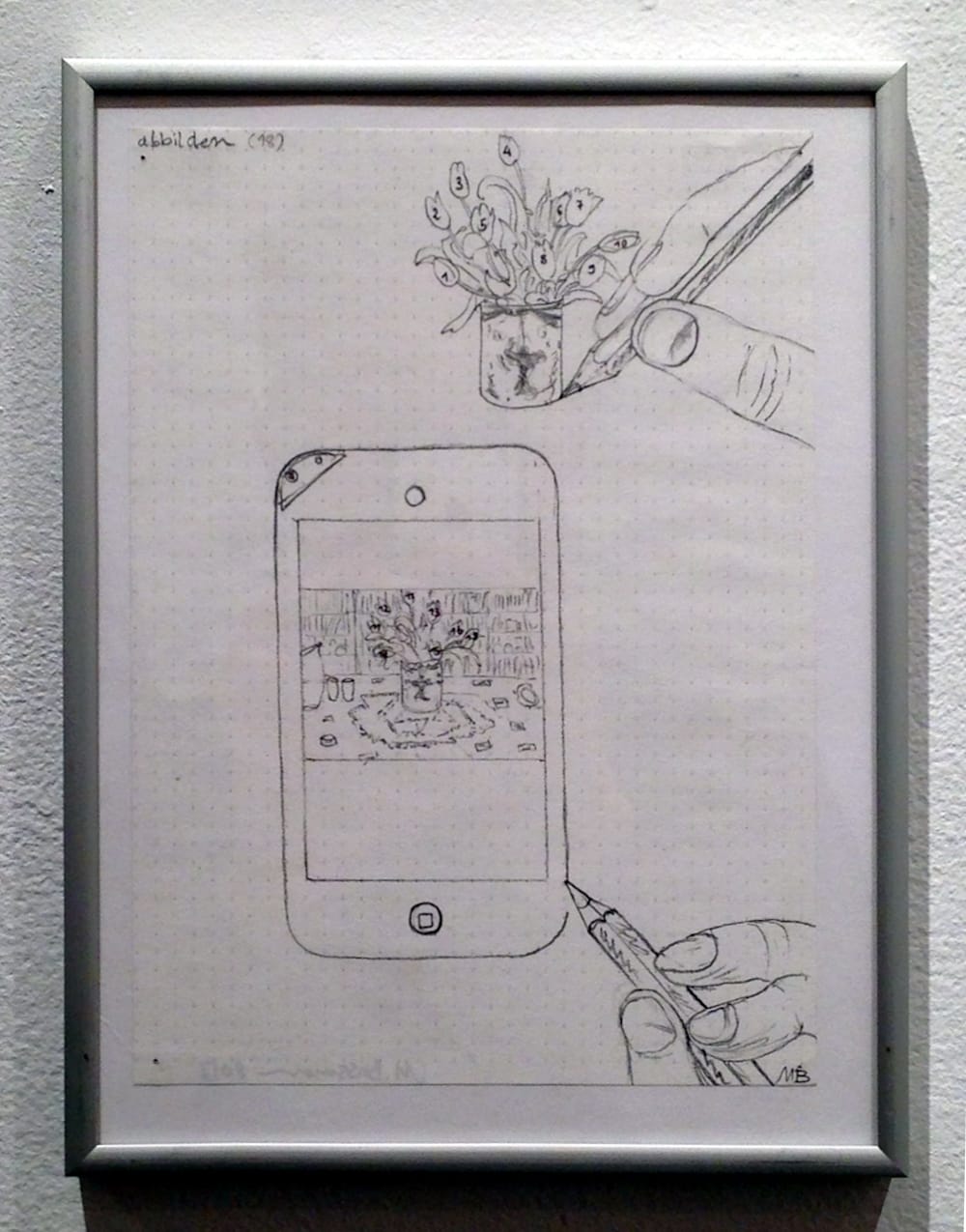 This approach may sound dry and forbidding, but it’s not. The images are sometimes straightforward, as in “abbilden” (“depict”), in which Bussmann draws two sets of hands, both wielding pencils: one sketches a tiny vase of flowers in the upper right corner, while the other puts the finishing touches on an iPhone displaying the same vase of flowers on its screen.