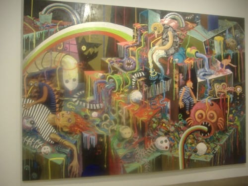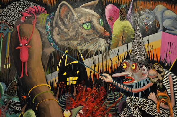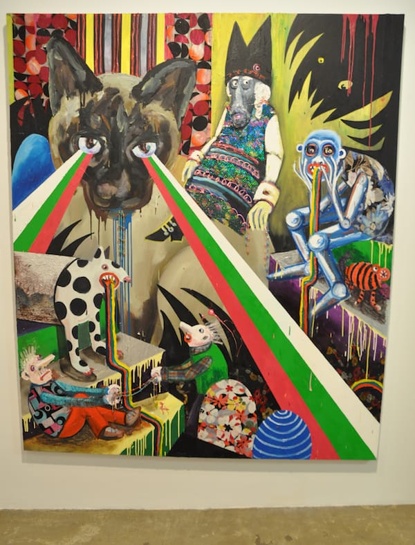 Filled with giant paintings of animals vomiting rainbows, the only phrase I can think of to describe German artist Stefanie Gutheil’s Dreckige Katze at the Mike Weiss Gallery is “technicolor puke.” But the show, which resembles Hieronymus Bosch on a bad acid trip, was anything but boring.