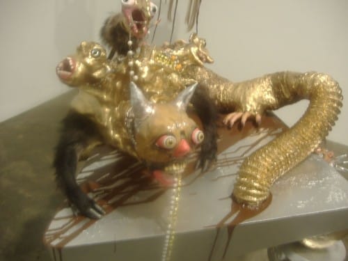 In addition to the paintings, Gutheil also had sculptures on display and they demonstrated a definite connection to the imagery in the paintings. “Table-Cat-Worm” (2011) features a cat barfing fake pearl necklaces with creepy toy eyes and big fake teeth. The effect of these sculptures are totally unsettling and frankly, I couldn’t look at them for very long without getting really weirded out.