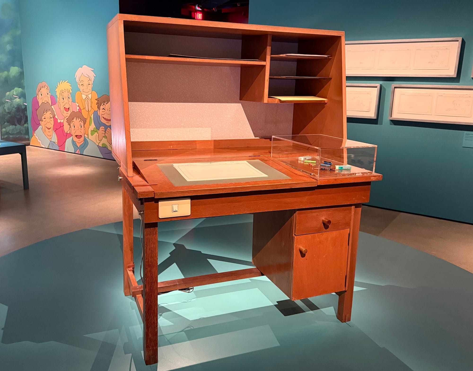 Ponyo is significant in part because it was completely hand-drawn, a return to form after some computer animation was used in previous Ghibli films. The exhibition features over 100 objects donated by Studio Ghibli, including several drawings by Miyazaki, highlighting the analog aspect of the film’s creation. The works are staged around a modest wooden desk used by Ghibli animators.