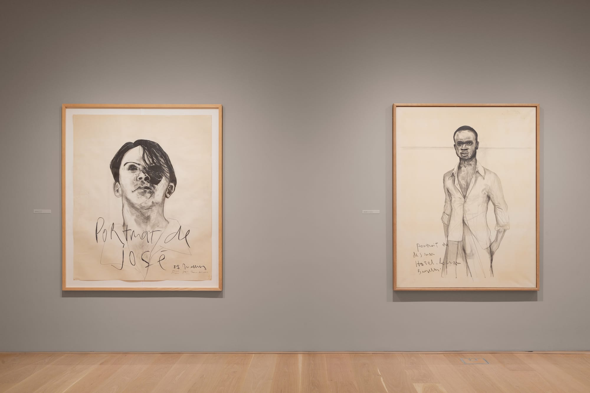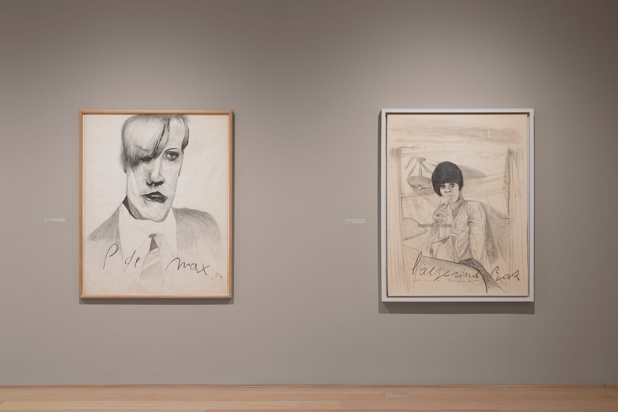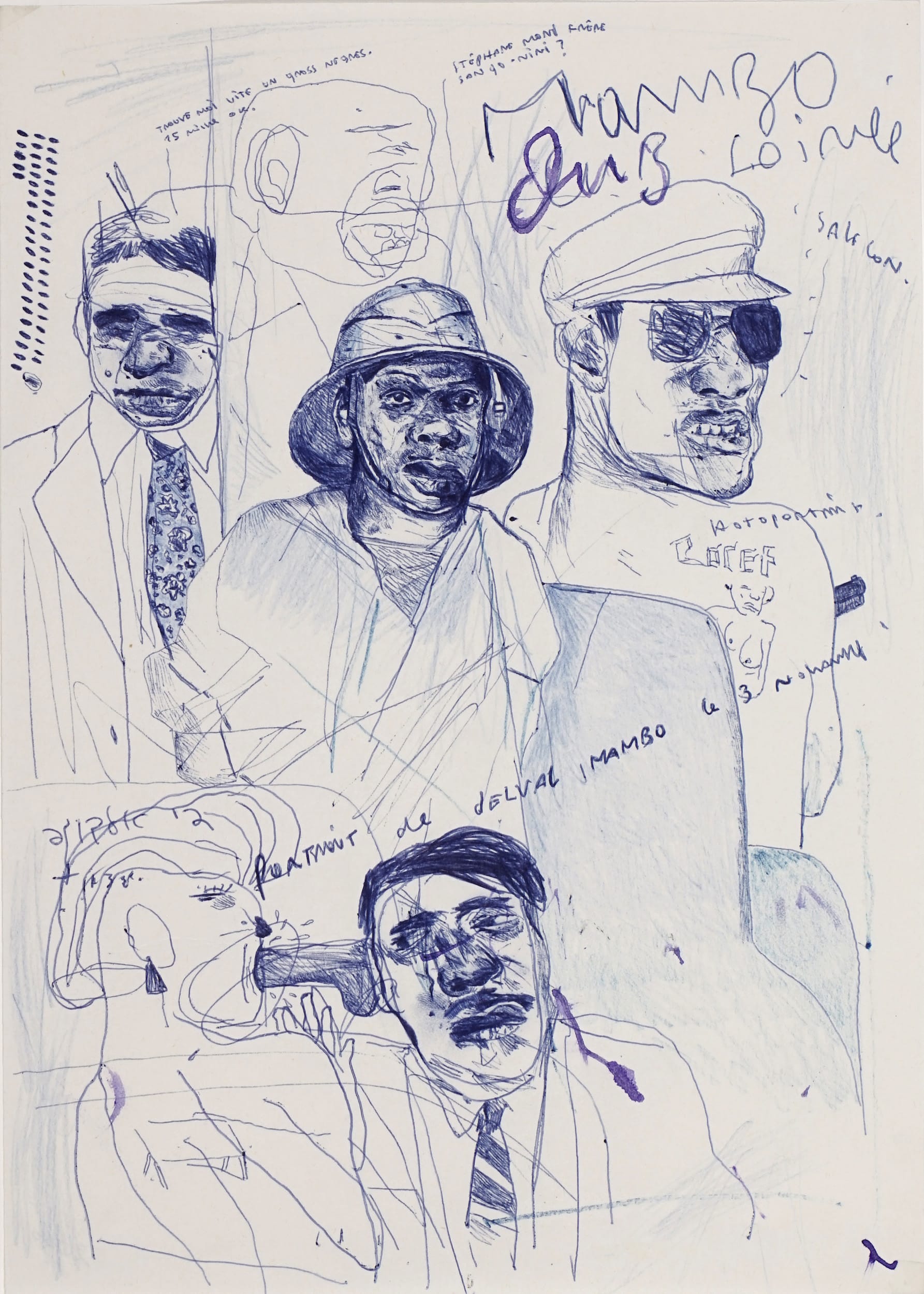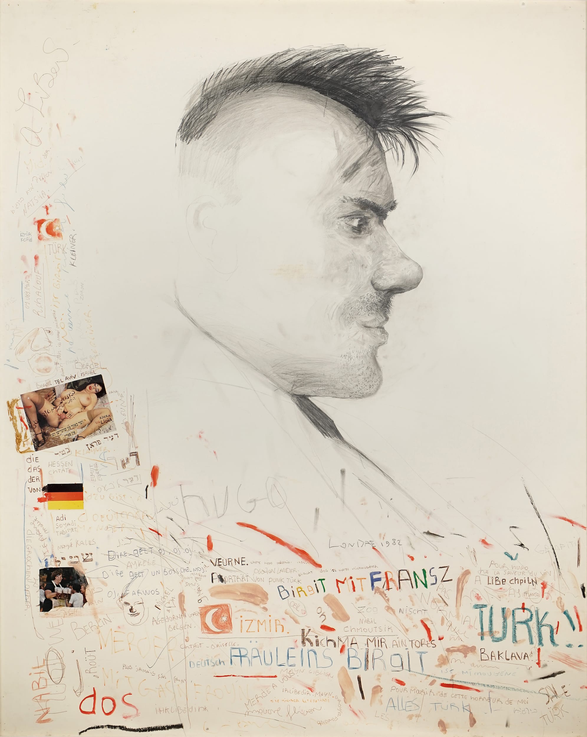 Anyone who speaks Hebrew, Yiddish, German, or French could easily spend hours trying to decipher the mess of language that litters the side of this work and many others in the exhibition, such as portraits of painters and poets that Mandelbaum admired, alongside Brussels underworld figures of sex workers, thugs, and pimps. The works include comments like “kosher” in Hebrew, “fucking Jew” in German, and “bitch” and “bastard Jew” in French. The artist's use of language conveys an emotional combination of outrage, hopelessness, revenge, and humor, all rolled into one.