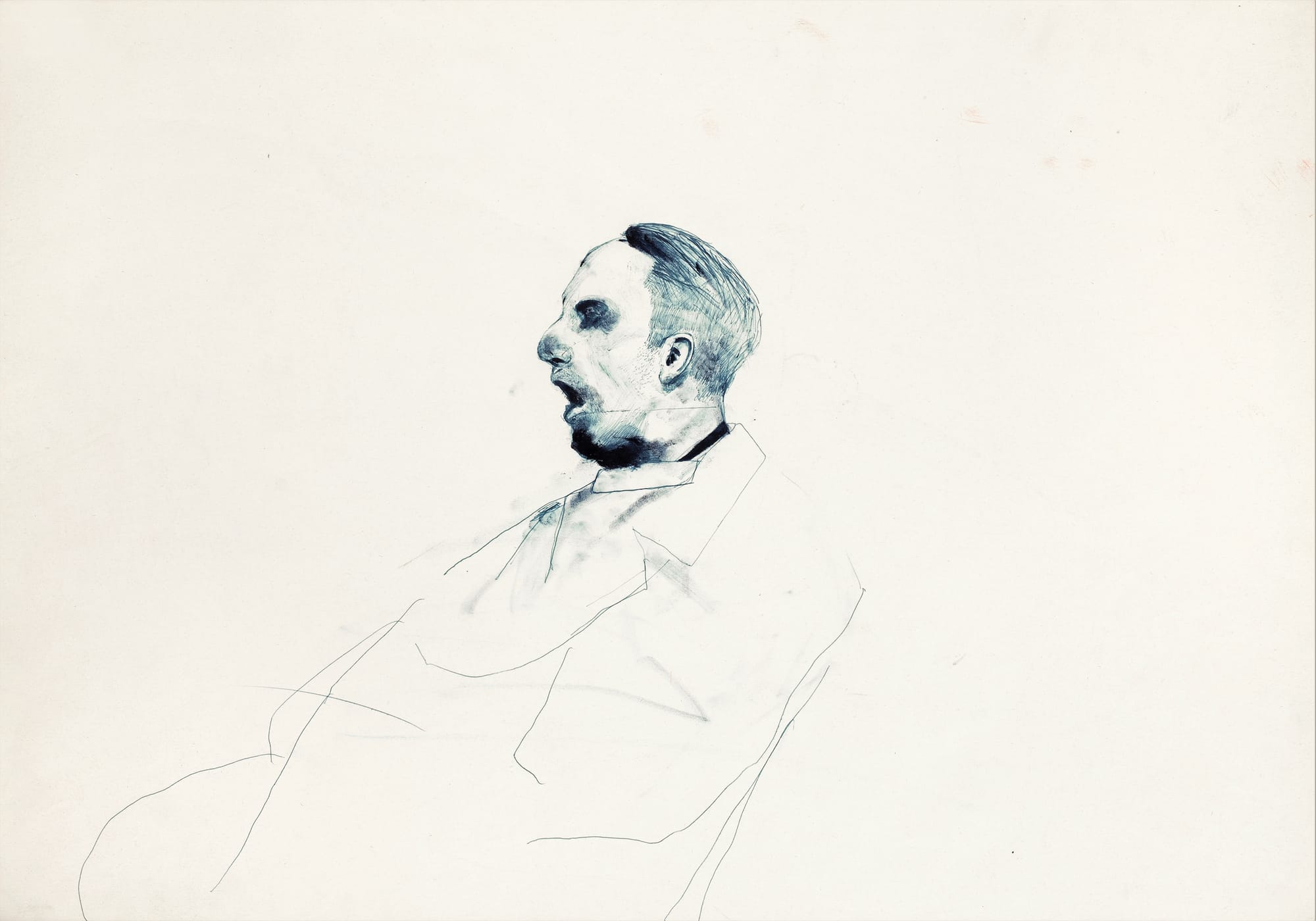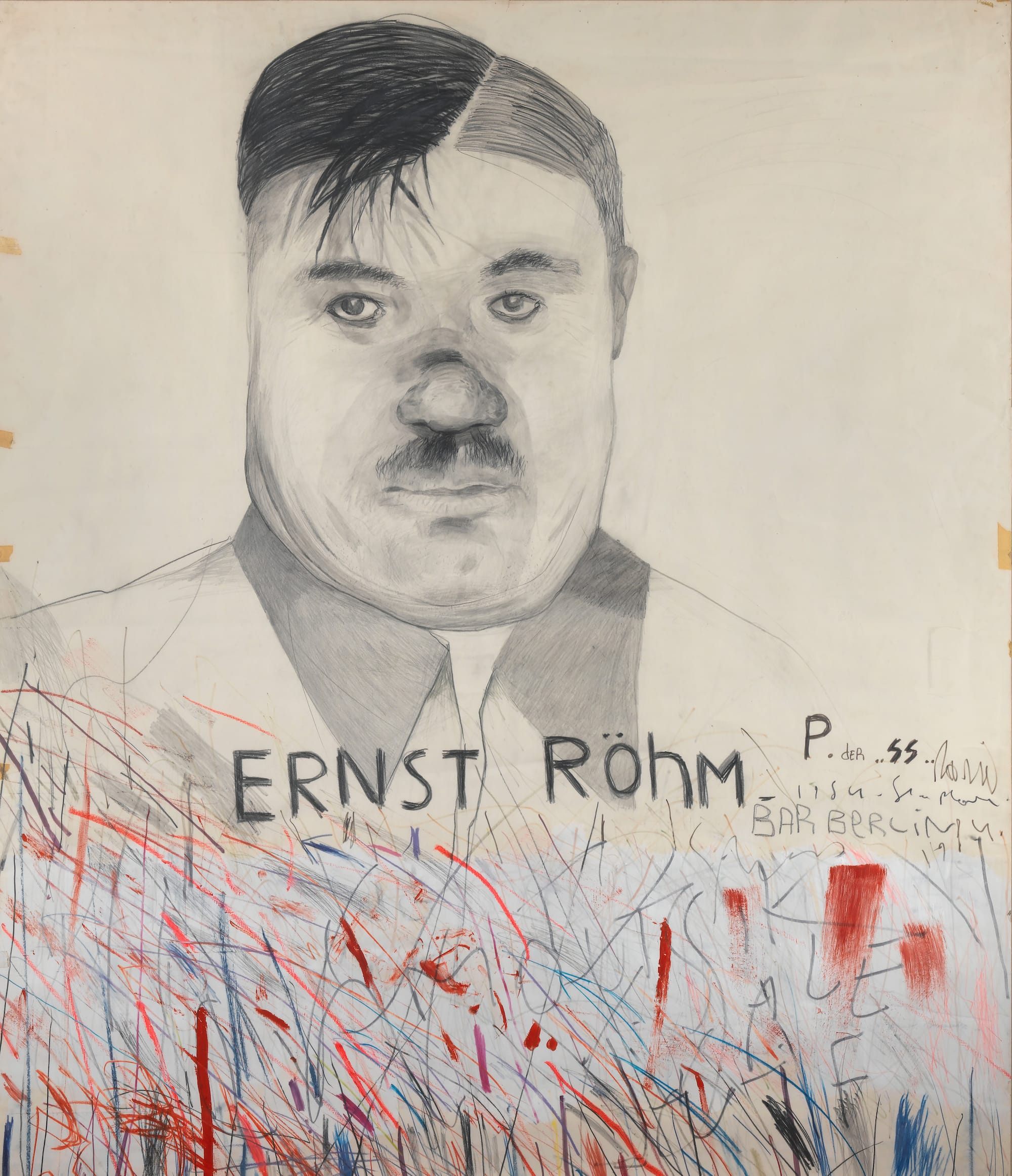 On the gallery’s center wall are Mandelbaum’s haunting portraits of Nazi party members. Here, portraits of Ernst Röhm, the early ally of Adolf Hitler and leader of the Nazi’s paramilitary wing, and Joseph Goebbels, the Nazi Minister of Propaganda, sit side by side. They come across as part devil, part human. Röhm’s bust sits atop a fiery pit of red, blue, and black scribbles and marks, with his name etched into the paper. Goebbels is more subdued: a few lines conjure a seated body, focusing all attention on the detailed face. Sketched in profile, we see a man with heavily shaded and closed eyes and a receding hairline, his mouth agape.