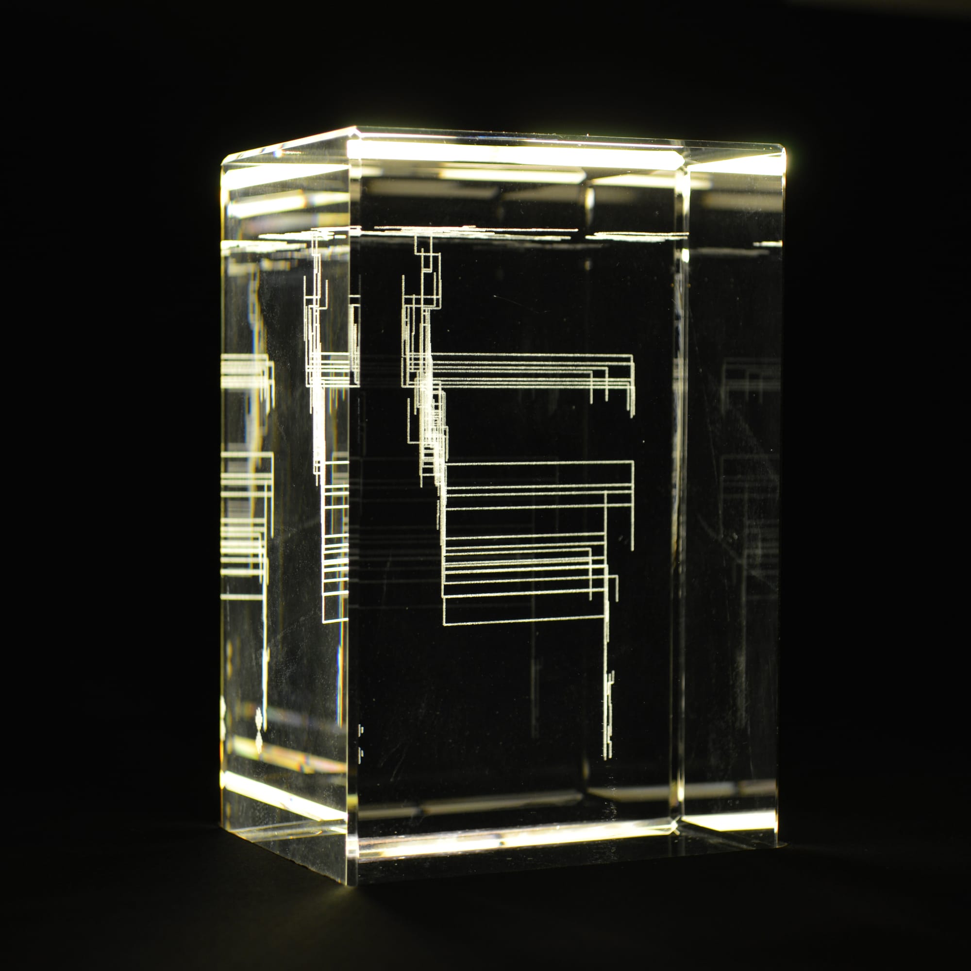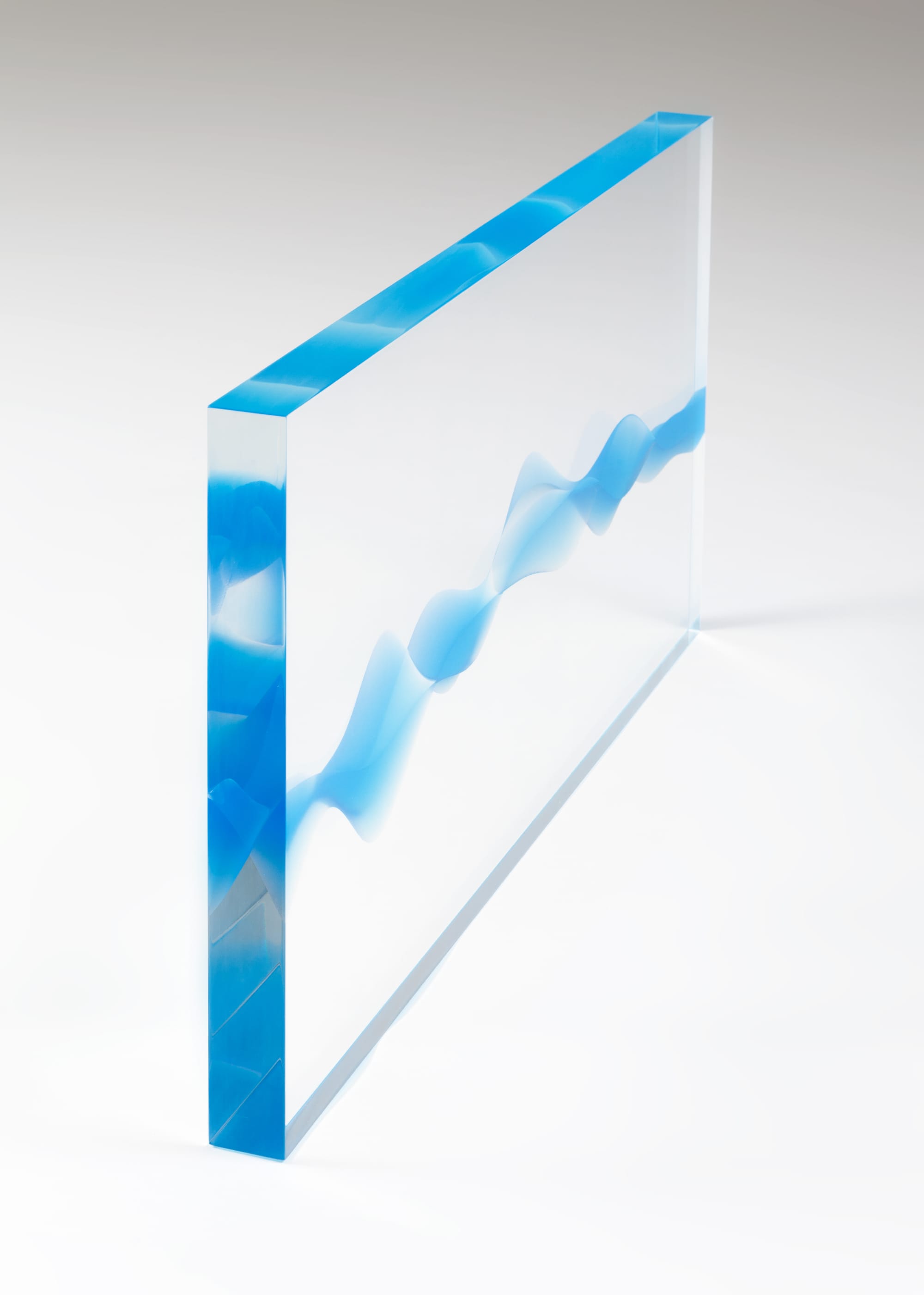 His artistic process these days involves creative collaboration with machines. He designs graphic representations of his collected data in 3D drawing software and uses them as the guide for a CNC (computer numeric control) router. This router will carve the design in great detail out of blocks of ultra-clear plexiglass, creating two pieces that fit nearly perfectly together. He then pours brightly colored resin into the space between them, before polishing them to the point where the entire piece appears to be a single block.