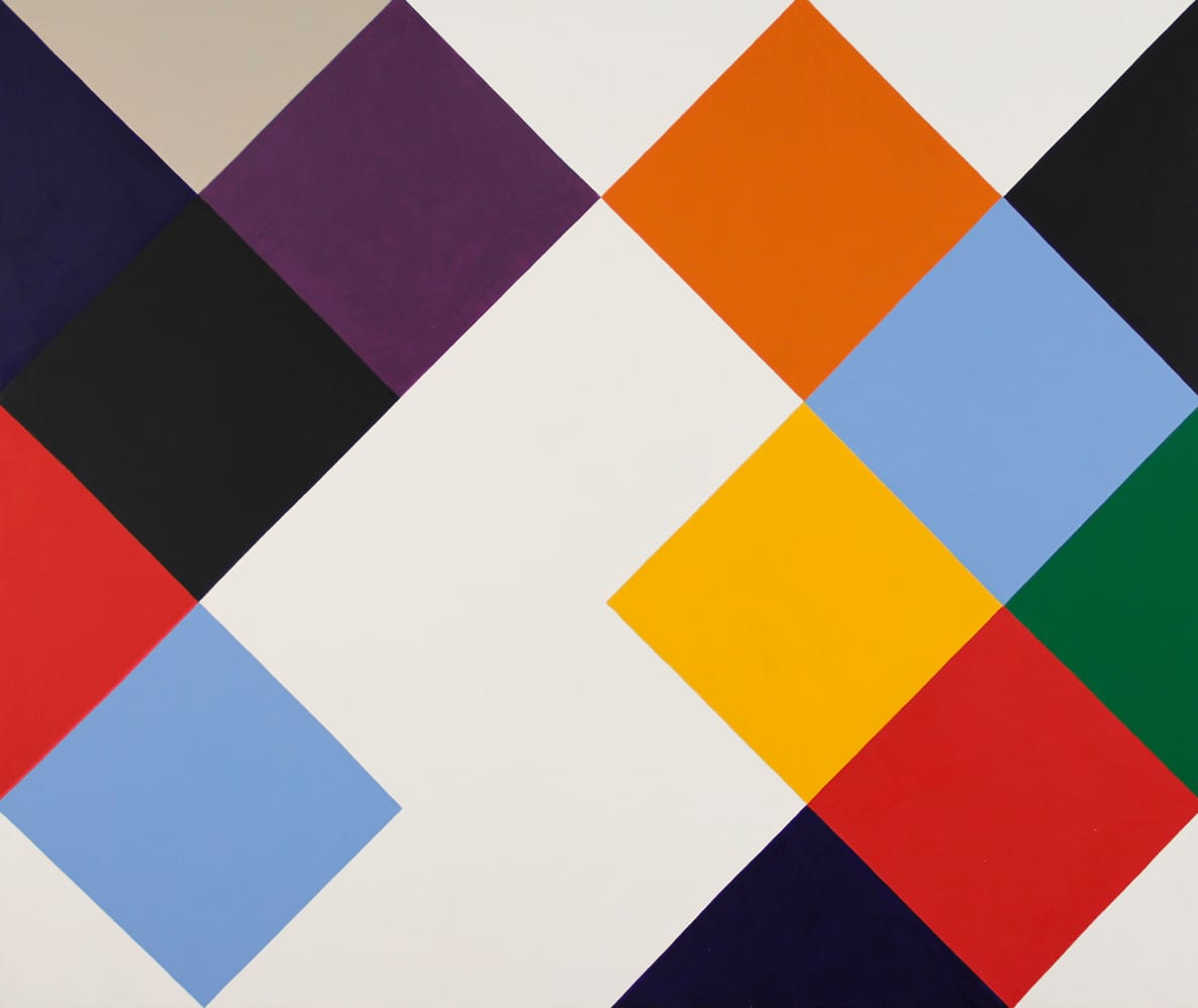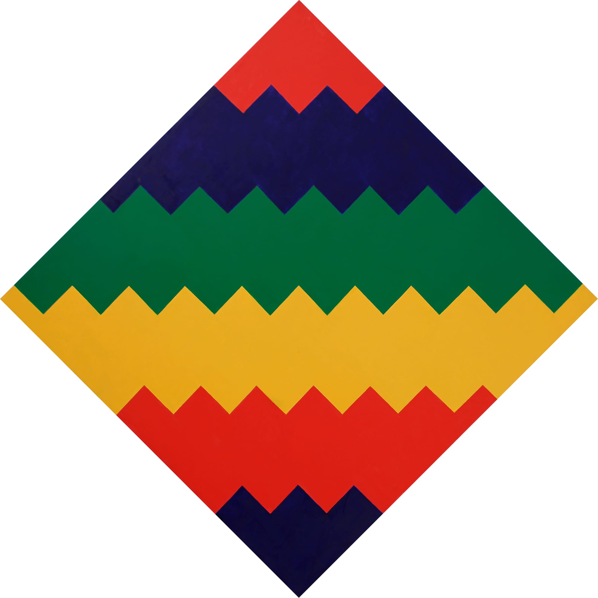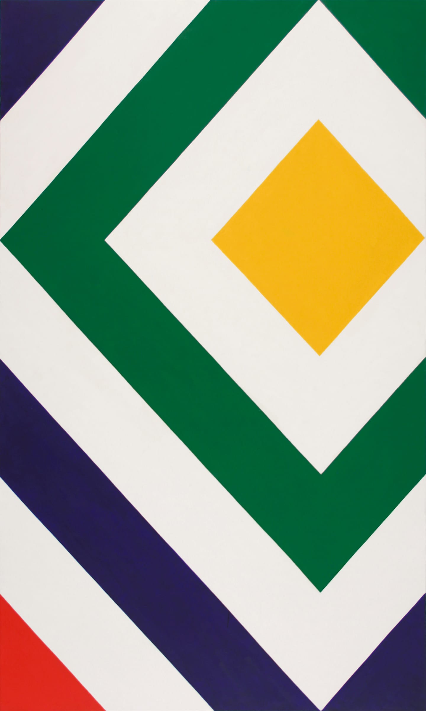The painting invites you to think about the relationship of the forms to the format. The placement of the yellow diamond, with its bottom point resting on the invisible horizon line dividing the painting into equal halves, is one of the ways that Westfall enables us to consider the internal relationships. Another is his placement of a red isosceles triangle in the lower left-hand corner, suggesting that there is a much larger band of red surrounding this partial view. Meanwhile, a green triangle is wedged into the upper right-hand corner, further anchoring the forms within the painting as well as underscoring their incompleteness.