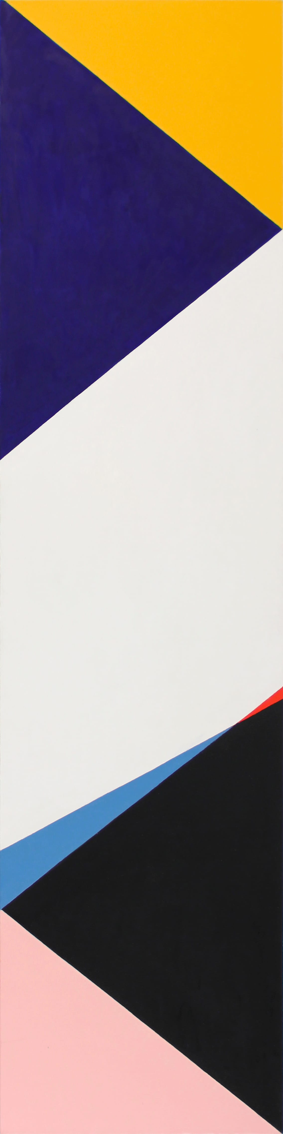 In “Solid Gone” (2018), which measures 72 inches by 18 inches, Westfall has fitted together two sets of isosceles triangles and right triangles at the top and bottom of the painting, forming two right trapezoids. A wide white diagonal band rising from left to right separates them, as well as echoes the white gallery wall behind the canvas, isolating the color shapes further. Painted blue and yellow, the top trapezoid flips between two triangles sharing one side to a pyramid with a blue and yellow face, night and day. However, instead of mirroring the top pairing, at the bottom Westfall adds two smaller scalene triangles, very different in size to each other, to one side of the larger black triangle, which locks the pink one into the lower left-hand corner.