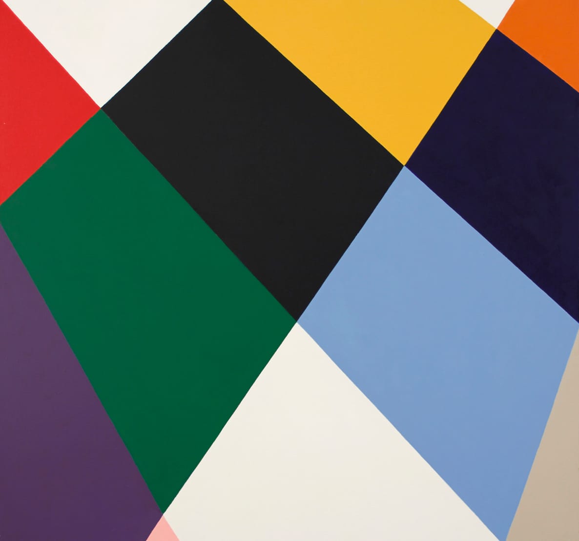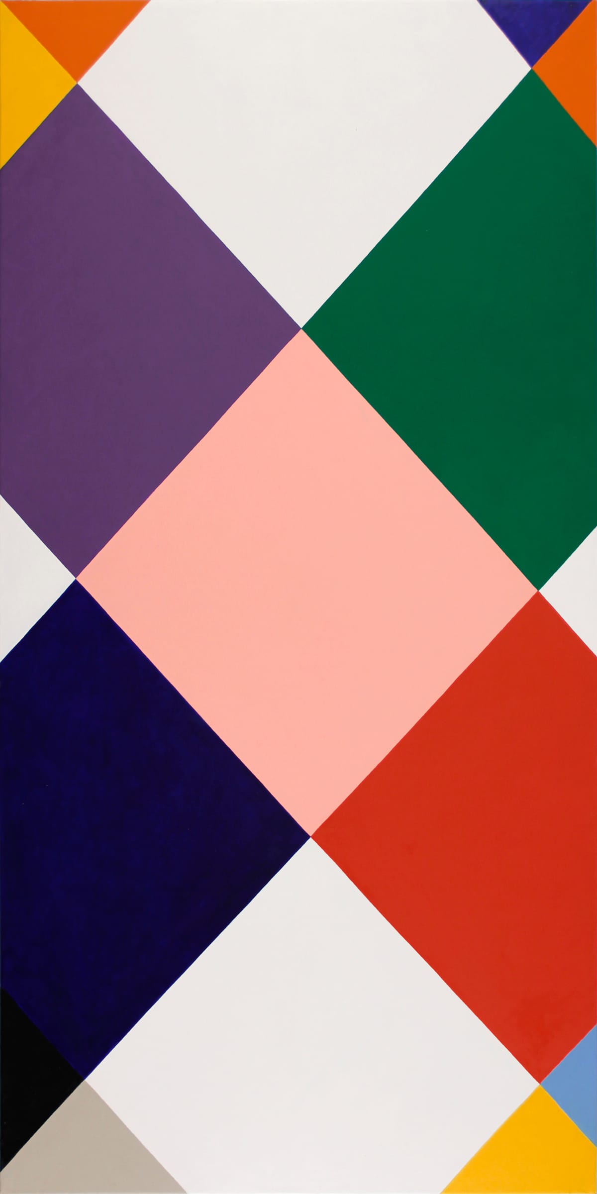In “Wild Card” (2018), which is twice as high as it is wide, a fleshy pink diamond, floating in the middle of the canvas, is the only complete form within the varied color pattern of diamonds holding it in place It is impossible to discern an underling pattern to Westfield’s color choices, in which most of the major shapes (other than the white, which could be read as a cropped diamond or a blank field, and the small yellow and orange triangles) do not seem match. This refusal to match colors is a rejection of the visual comforts offered by the grid and by pattern and decoration. In the nearly square “Veil” (2018), the plane formed by the differently colored trapezoids and triangles seems to tilt away from the picture plane as well as warp slightly in space as it rises from the bottom edge. The pressure exerted against the edges of these tightly fitted geometric shapes is not uniform.