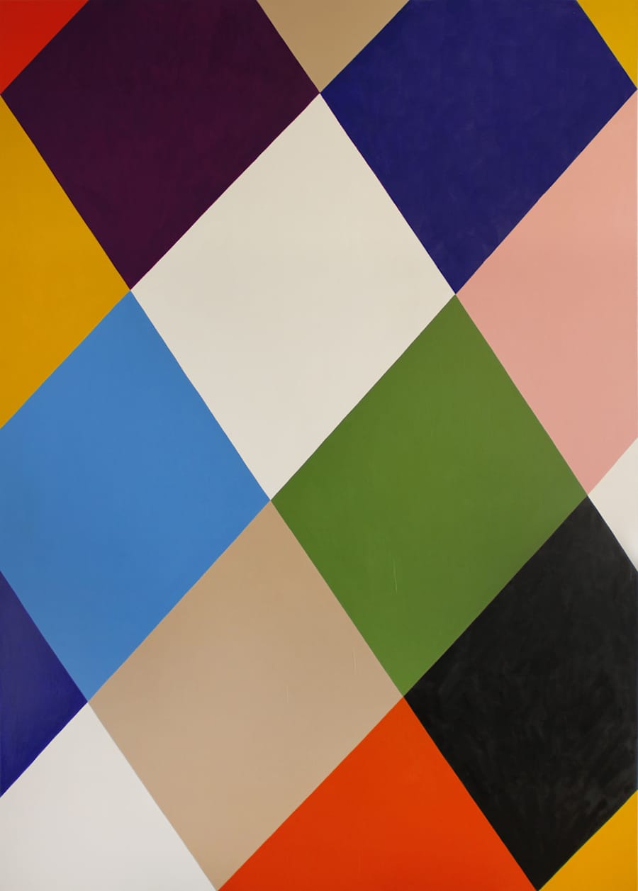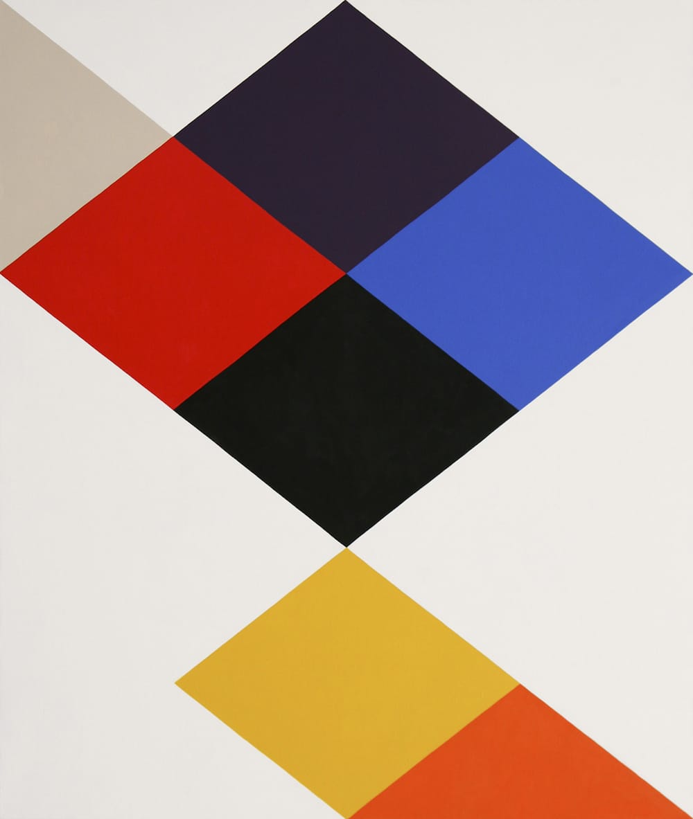 Separating these clusters of colored diamonds and triangles is a wide, white zigzag running, like a geometric lightning bolt, from the canvas’s top left edge to its center bottom. One might initially think the painting is unfinished, that the artist hasn’t decided what colors and shapes (triangles or diamonds) to put there. At the same time, the white of the painting links it to the gallery’s white wall. Is the white zigzag part of the painting or part of the wall or both? Is it the ground on which the other colors have been laid down, or a purposefully painted white geometric shape equal to the ones around it? Is it a sign of incompleteness, or evidence of architecture and the surrounding environment invading the painting?